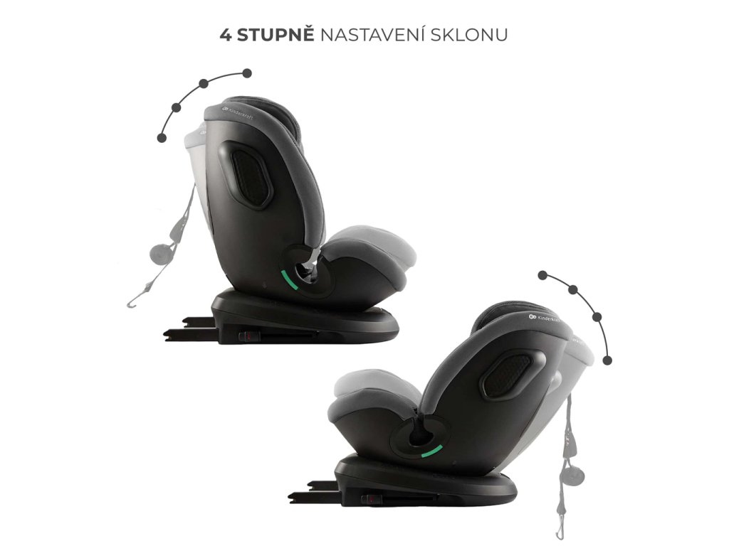 Funkce RECLINING umožňuje nastavení zádové opěrky autosedačky pomocí 4-stupňového nastavení úhlu sklonu sedadla v poloze RWF i FWF, což umožňuje dítěti zaujmout pohodlnou polohu během spánku nebo při aktivitě.