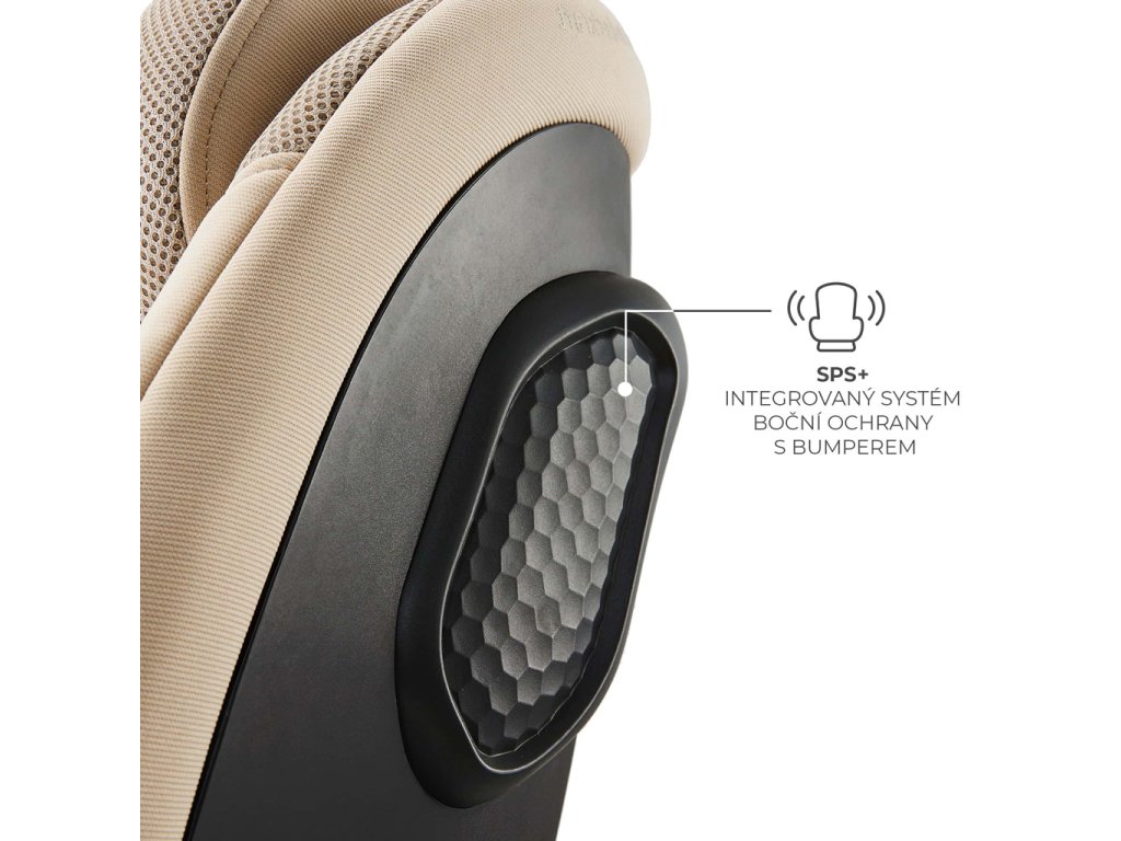 Systém SPS+ s přídavnými bočními prvky efektivně absorbuje a rozptyluje počáteční a nejsilnější sílu nárazu, čímž vytváří ochrannou bariéru kolem dítěte. Zaručuje bezpečnost klíčových částí těla, jako je hlava a trup.