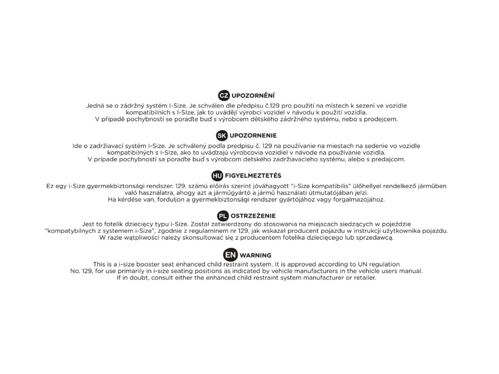 UPOZORNĚNÍ! Toto je zádržný systém i-Size. Je schválen dle předpisu č. 12. 129 pro používání na místech k sezení ve vozidlech kompatibilních s i-Size, jak to uvádějí výrobci vozidel v návodu k používání vozidla. V případě pochybností se poraďte buď s výrobcem dětského zádržného systému nebo s prodejcem.
