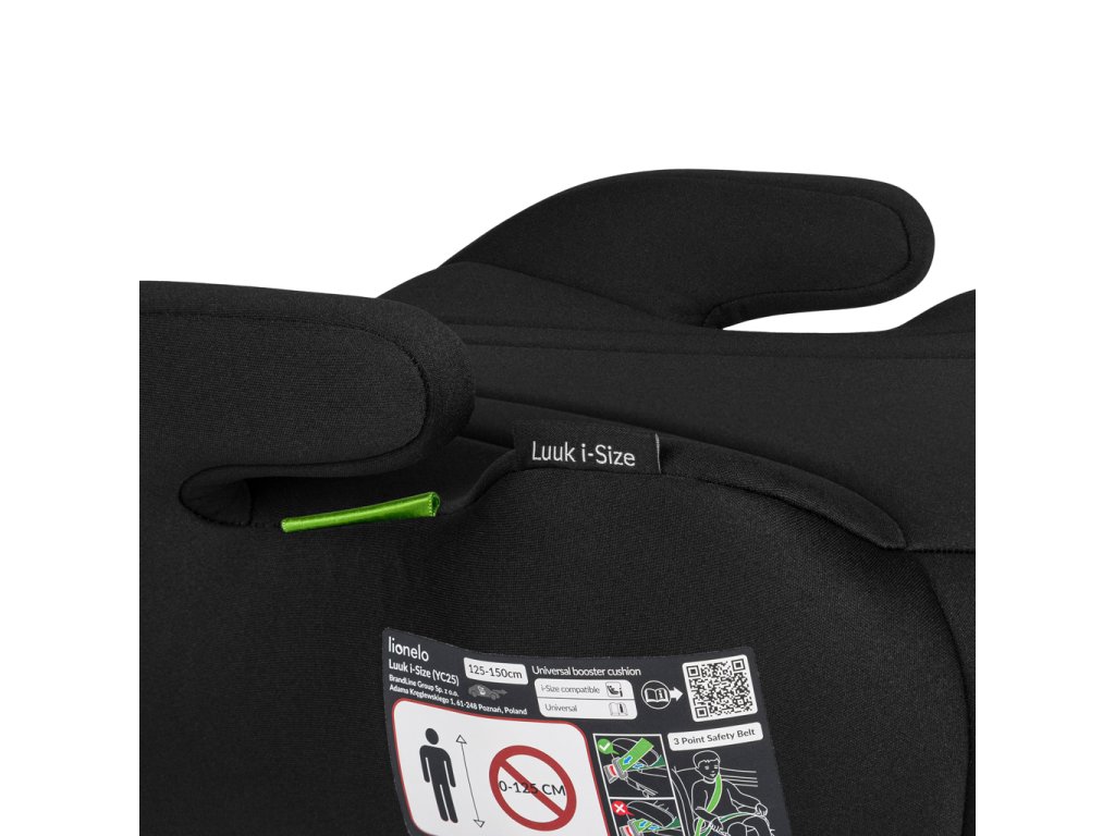 Lionelo Luuk i-Size je podsedák určený pro děti vysoké 125 až 150 cm. Podsedák je určen k montáži na bezpečnostní pásy auta, po směru jízdy. Díky univerzálnímu způsobu montáže je vhodný pro téměř každý model automobilu. Sedačka splňuje přísné evropské normy schválení R129, známé také jako i-Size. Široké sedátko bylo navíc potaženo EPE pěnou pro ještě větší pohodlí. O pohodlí malého se starají také područky, které umožňují tělu zaujmout správný postoj během cesty.
