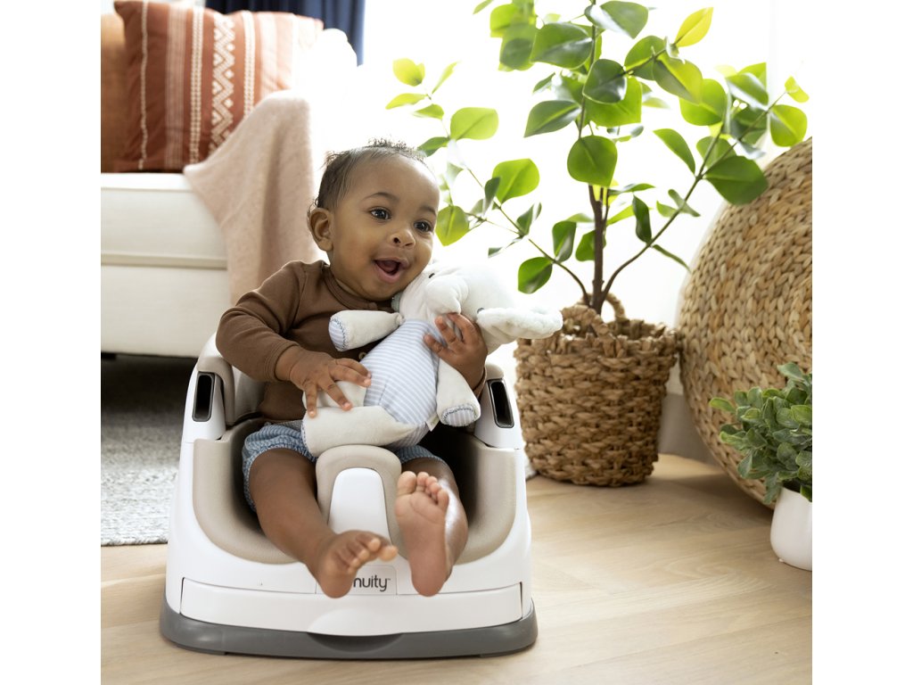 Podsedák se snadno upevňuje na jídelní židle. Funkce 2v1 Vám umožňuje použít jej jako sezení u stolu, ale také jako sedátko na podlaze během volného času. Díky odnímatelnému pultíku má děťátko vlastní stůl dokonalé velikosti, kde občerstvení i hračky jsou na dosah. Pokud se nepoužívá, pohodlně se vyklopí pod samotné sedátko.
