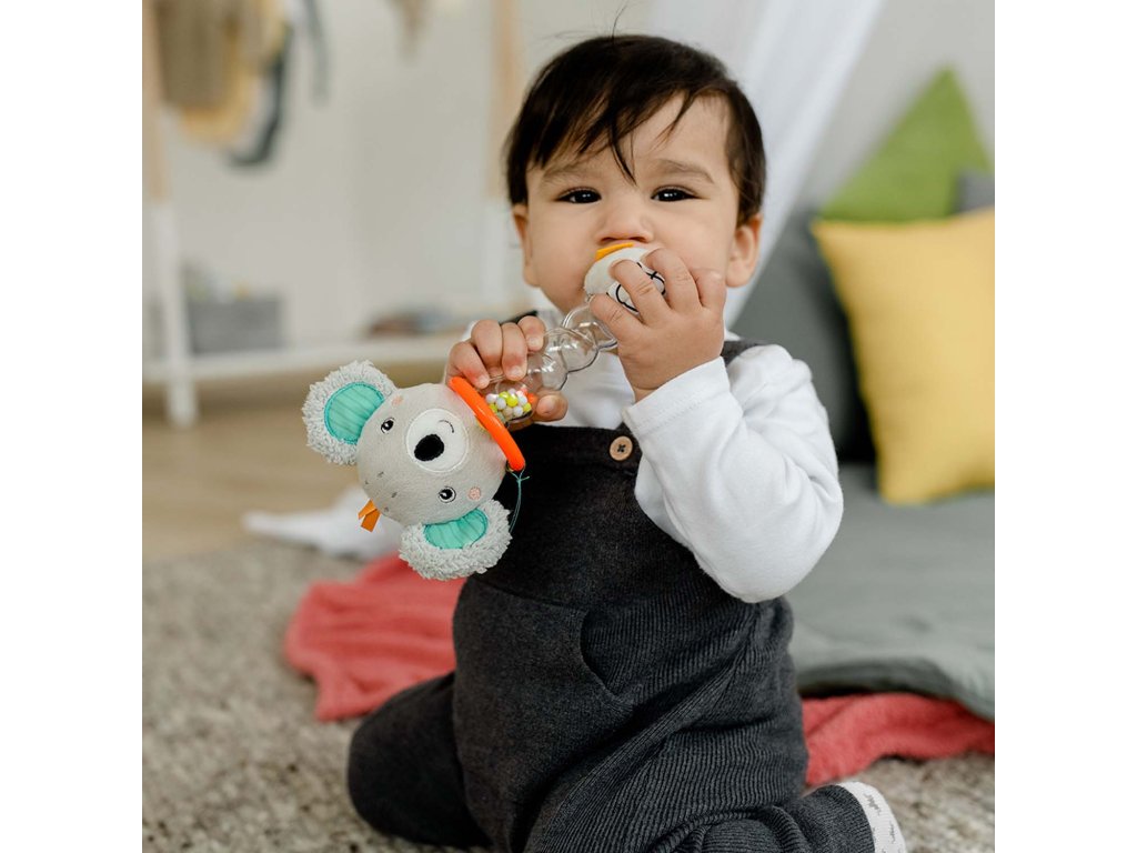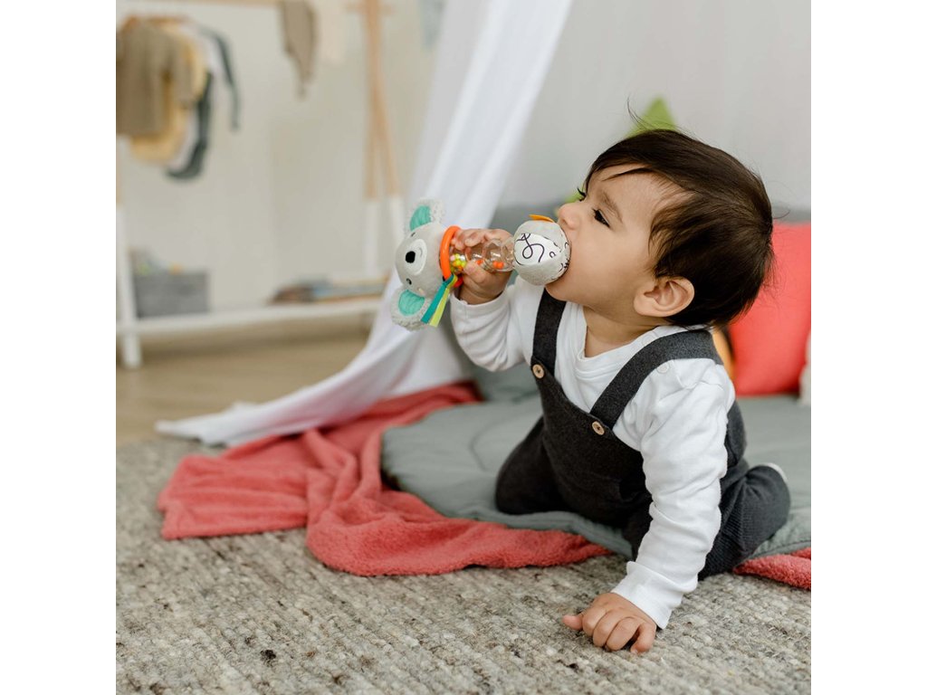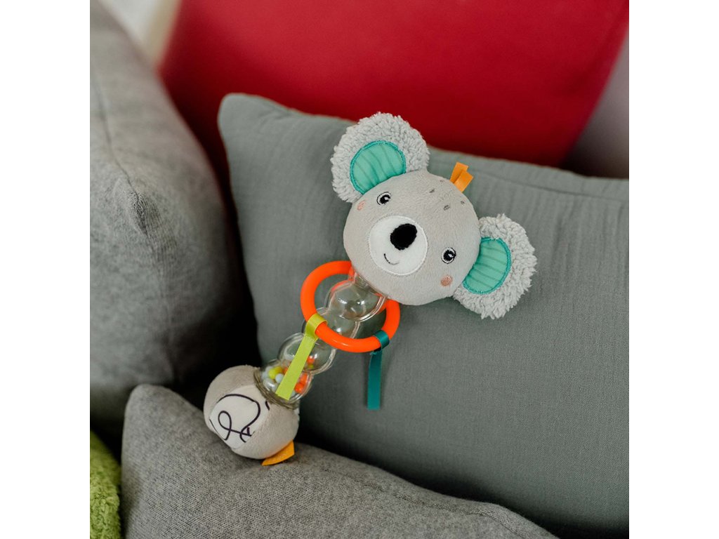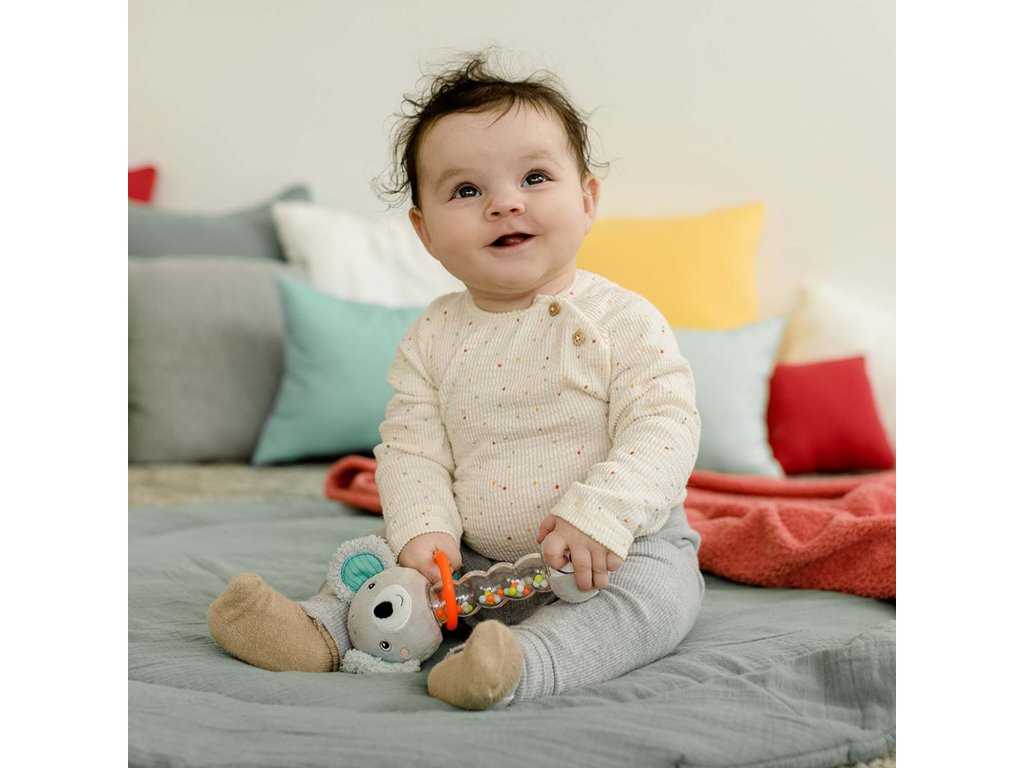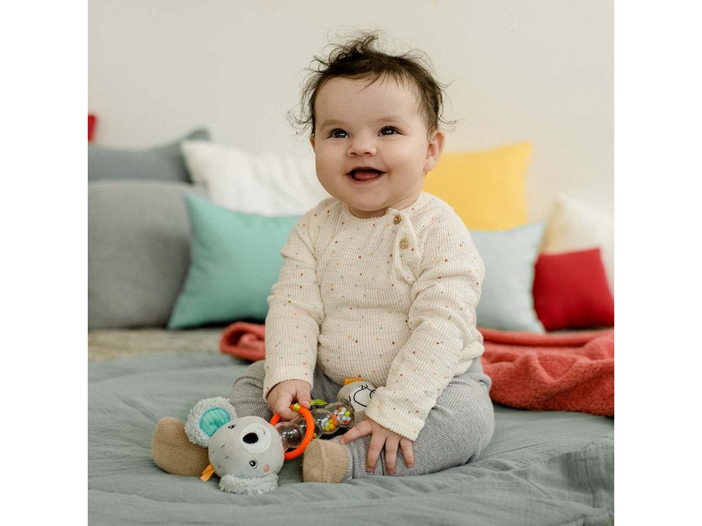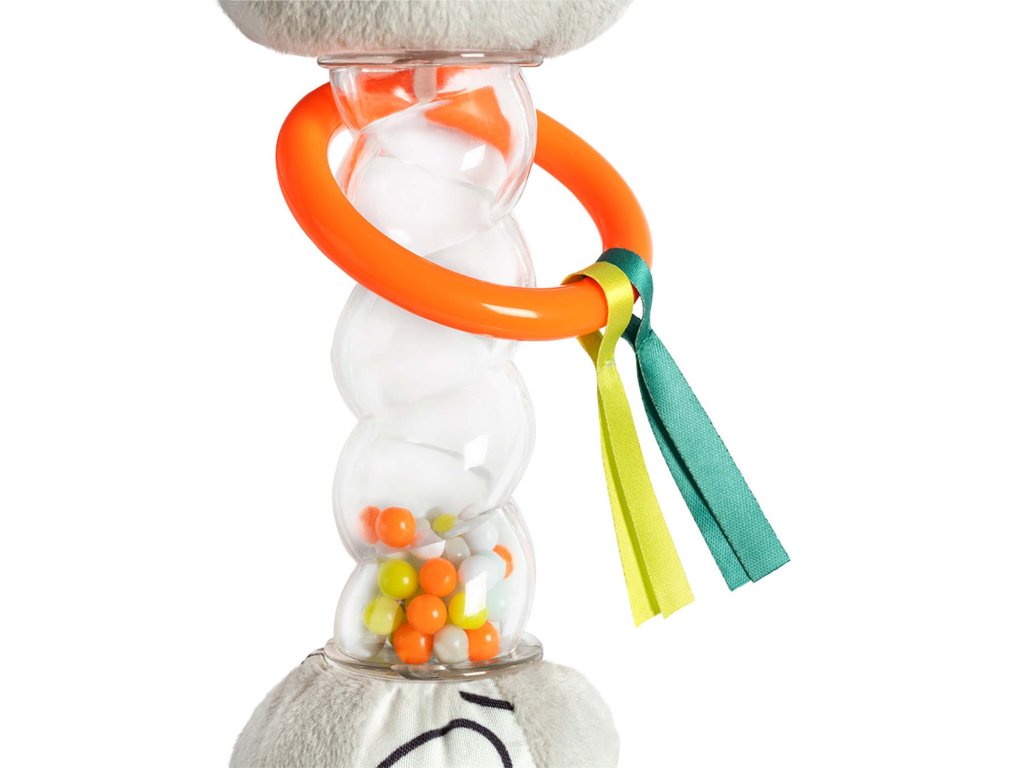 Plyšové chrastítko se spoustou aktivity prvků jako je úchopový kroužek, chrastítko, pískací mechanismus a skřípavý papír. Hračka na uchopení hravě podporuje sluch dítěte, smysl pro zrak, hmat, zdravé uchopení a logické myšlení – ideální jako dáreček pro chlapce a dívky k narození, narozeninám či křtu.