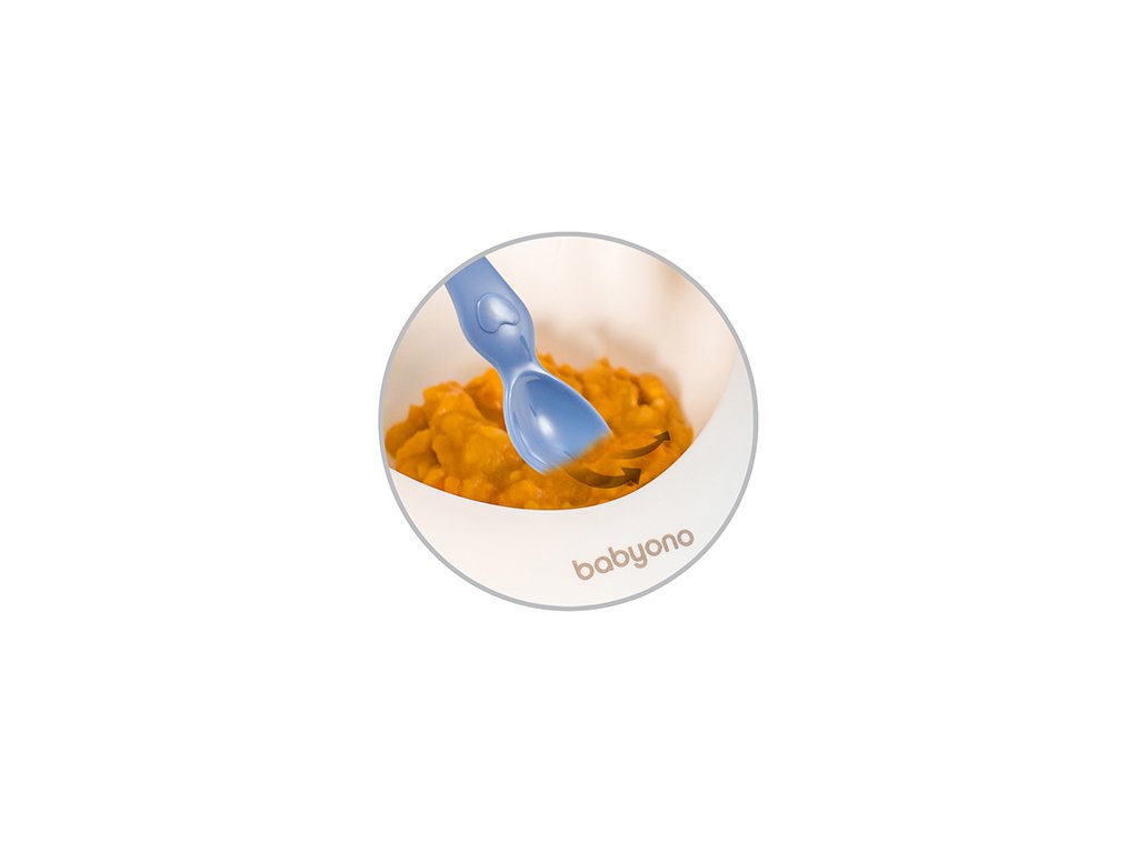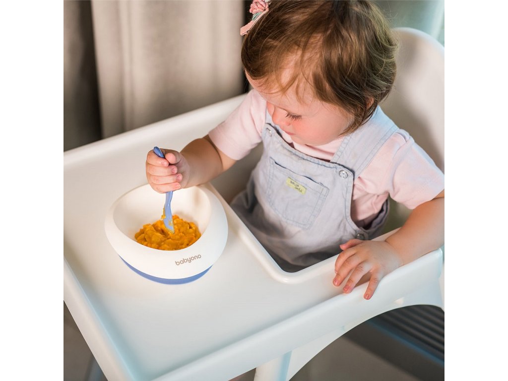 Dvoudílný set k jídlu z měkkého plastu bez BPA je velmi praktický, snadno uchopitelný a protiskluzový. Set obsahuje misku s přísavkou a lžičku. Oválný tvar misky usnadňuje nabírání jídla, zatímco přísavka na misce zabraňuje jejímu pohybu po stole a tím rozlití jídla a pomáhá udržovat věci čisté.