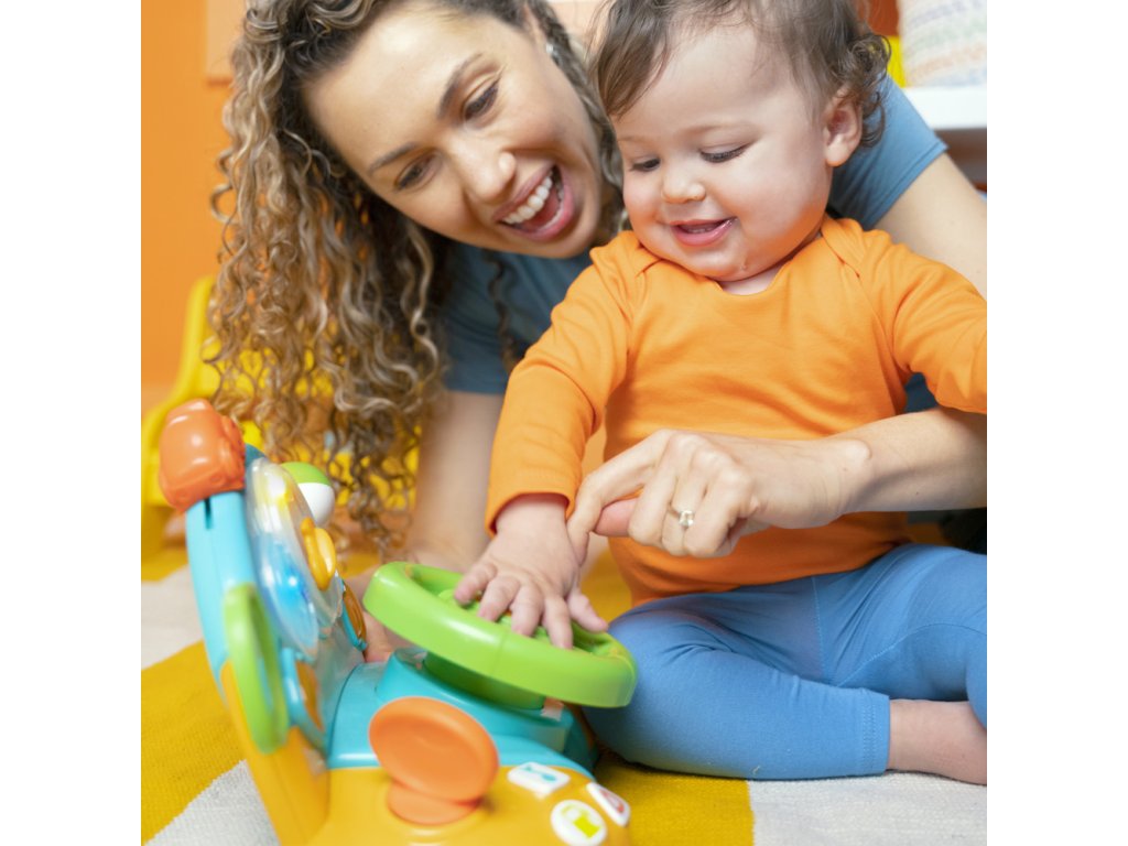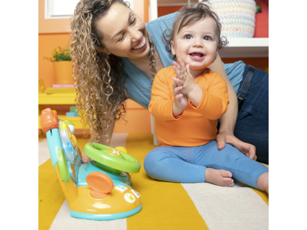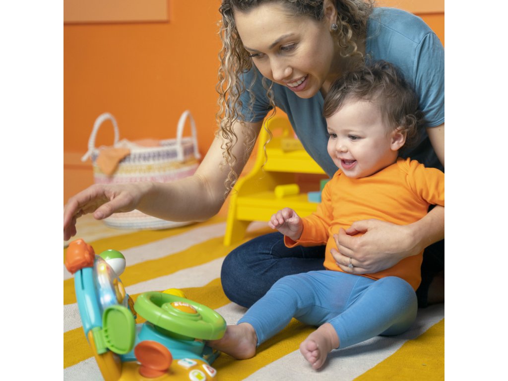 Šlápněte na pedál... dítě je na cestě za zábavou! Díky skutečným zvukům auta, řazení rychlostních stupňů a volantu, kterým lze otáčet a kroutit, se vaše děťátko chystá na jízdu svého života. Zapněte si melodie na autorádiu, nastavte zrcadlo a otočte směrovkami a vydejte se na cestu podle fantazie vašeho dítěte. Měňte rychlostní stupně, abyste naučili svého malého řidiče poznávat čísla a tvary, kde mačkáním tlačítek se hračka rozsvítí.