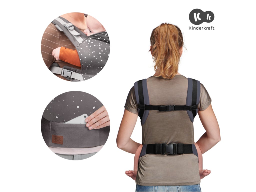 - Nosič má speciální kapsu na drobnosti rodiče, která je umístěna v bederním pásu. Schováte tam nejen mobil, ale také klíče a malou peněženku.
