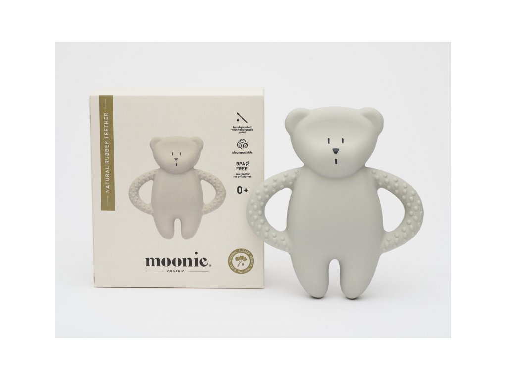Kousátko MOONIE podobě roztomilého medvídka z přírodního kaučuku bylo pečlivě navrženo tak, aby zklidnilo bolavé dásně během prořezávání zoubků a zároveň poskytovalo bezpečný a příjemný smyslový zážitek. Tvar a velikost kousátka umožňují snadné držení malými dětskými ručičkami, různorodé textury lákají dítě ke zkoumání. Hračka je ručně malovaná netoxickými potravinářskými barvami.