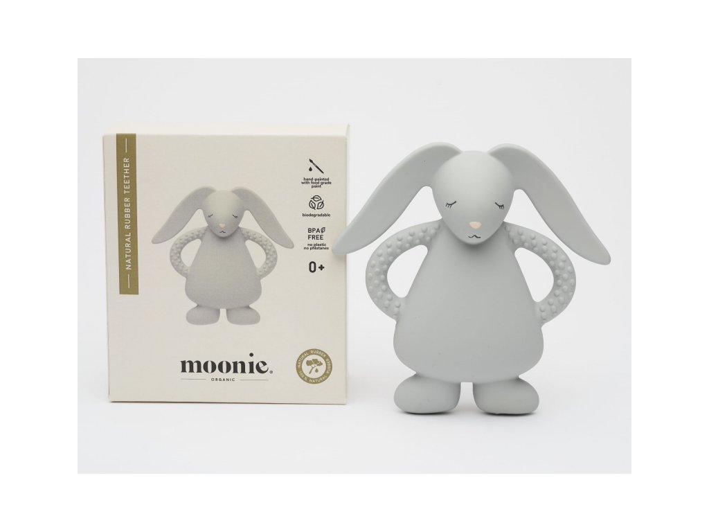 Kousátko MOONIE podobě něžného zajíčka z přírodního kaučuku bylo pečlivě navrženo tak, aby zklidnilo bolavé dásně během prořezávání zoubků a zároveň poskytovalo bezpečný a příjemný smyslový zážitek. Tvar a velikost kousátka umožňují snadné držení malými dětskými ručičkami, různorodé textury lákají dítě ke zkoumání. Hračka je ručně malovaná netoxickými potravinářskými barvami.