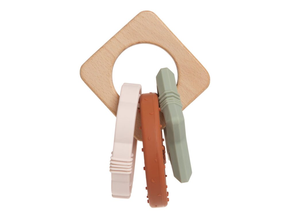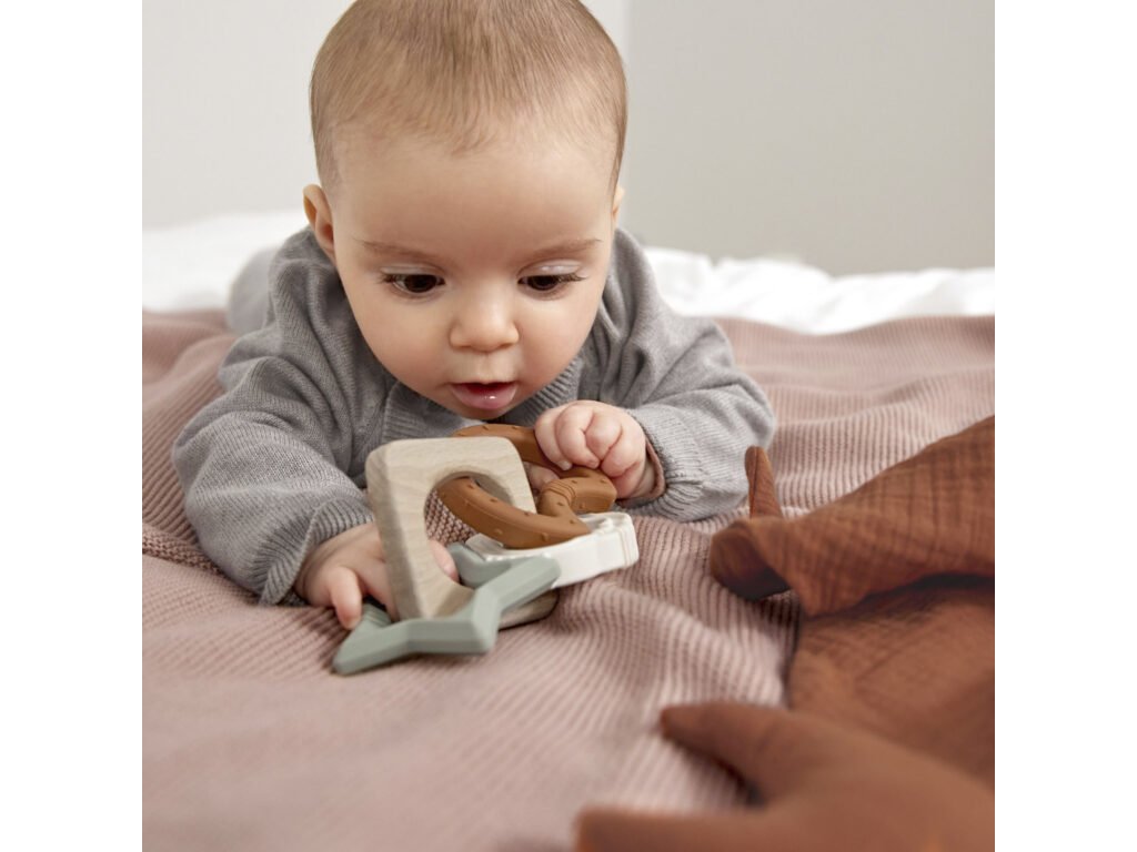 Smyslová hračka s různými strukturami a povrchy má zklidňující účinky na dásně a pomáhá redukovat bolest v době prořezávání zoubků. Výrobek je vhodný pro děti od 4 do 18 měsíců.