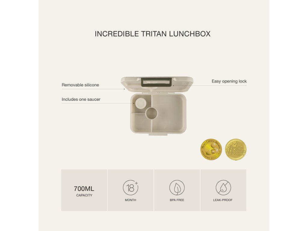 Box je vyrobený z materiálu Tritan odolného proti rozbití, a proto vám vydrží velmi dlouho. Je navržený tak, aby se dal snadno umýt, umožňuje rozdělit jídlo do 4 různých oddílů, včetně kulatého ve středu krabičky určeného pro nádobku na omáčky, která je jeho součástí.