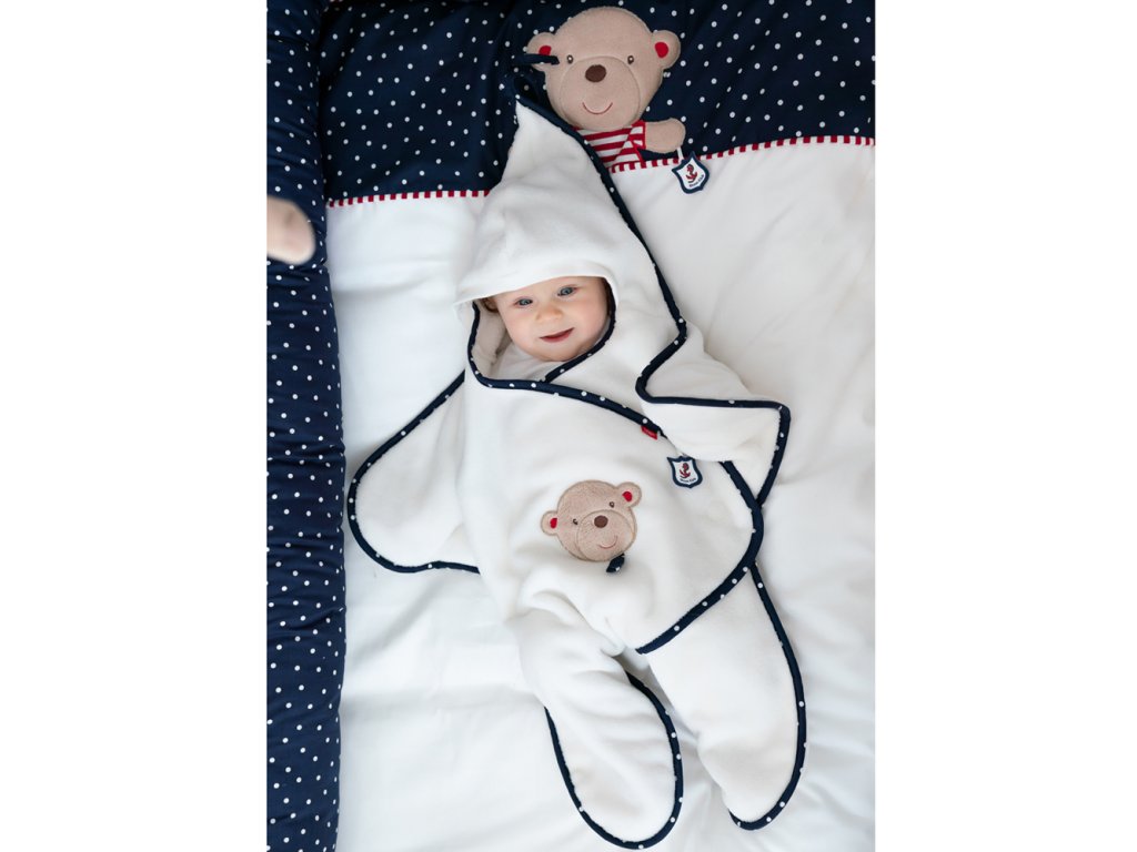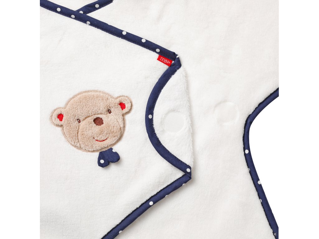 Přikrývka je plyšově měkká a pohodlná pro dítě, praktická kapuce chrání jeho hlavu a uši.