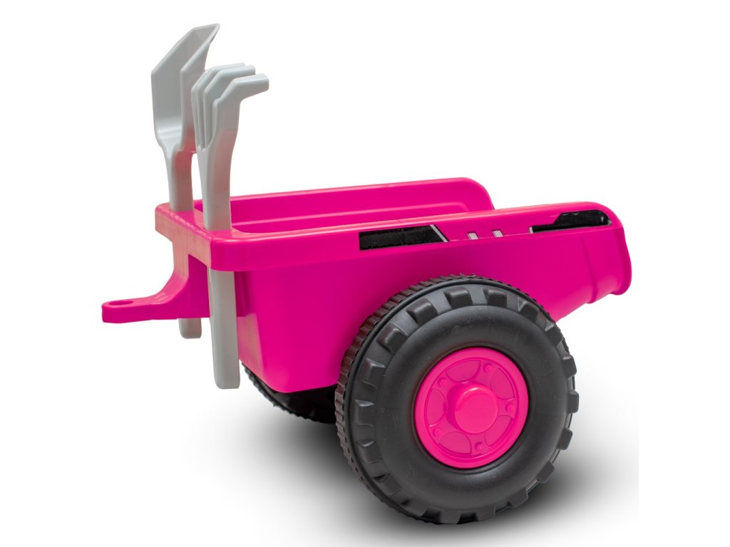 Traktůrek má rozměry 89 × 32 × 35,5 cm, je lehký, ale zároveň stabilní a zvládne zátěž až 25 kg. Protiskluzová kola se postarají o bezpečnou jízdu, a když se malý řidič rozjede, může navíc zatroubit houkačkou. Do přívěsu se vejde vše potřebné – od hraček až po písek – a díky přiložené lopatce a hrábím může začít hned pořádná práce na „poli“.