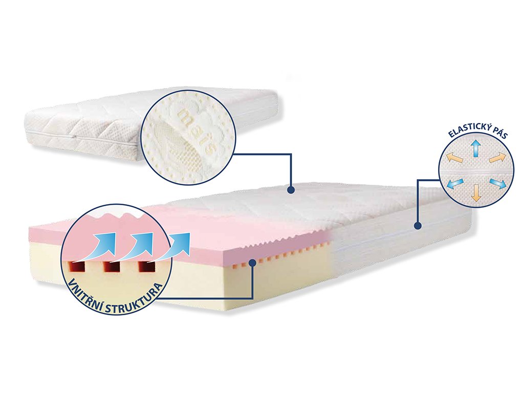 JÁDRO: je vyráběno spojením dvou vrstev. První vrstva je z tužšího polyuretanu a druhá vrstva je z inovativního "PUR-O" polyuretanu. Tento materiál je výsledkem výzkumu a jední se o materiál nové generace, ze které se získá vysoce pružná pěna, zajišťující nedeformovatelný produkt při zachování vysoké prodyšnosti s ohledem na maximální pohodlí.