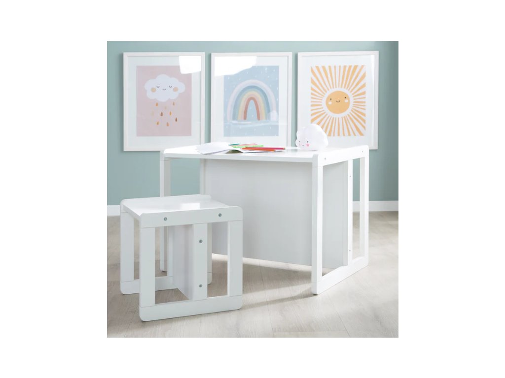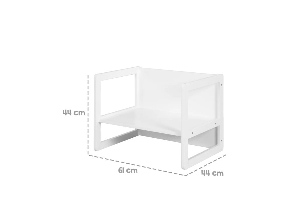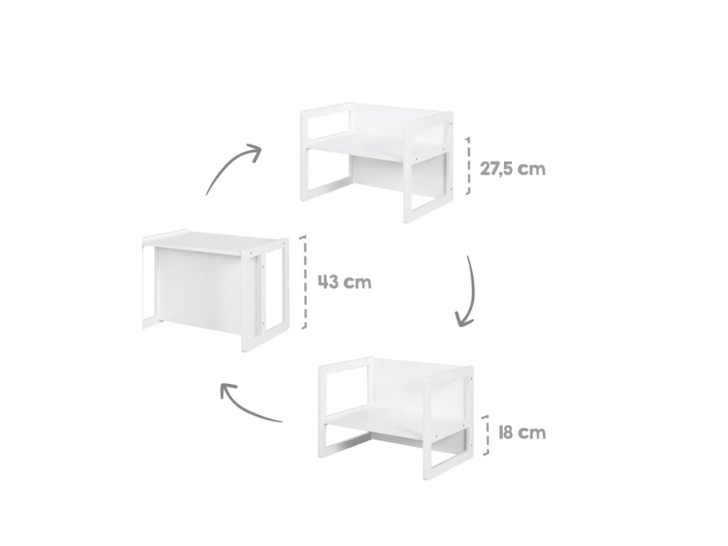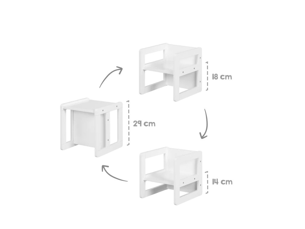 Multifunkční dětský nábytek 3 v 1 lze otočením taburetu změnit na tři různé výšky sedáku (výšky sedáku: 14 cm, 18 cm nebo 29 cm). Celkové rozměry: výška: 30 cm, šířka: 30 cm, hloubka: 30 cm.