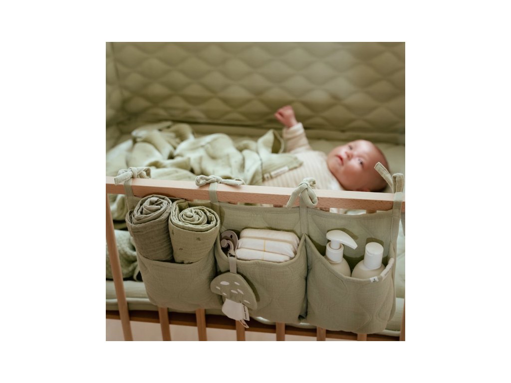 Praktický závěsný organizér v krásném provedení s ozdobným prošíváním vám umožní mít vše potřebné pro péči o vaše miminko vždy po ruce. Organizér ze 100% organické bavlny nabízí tři prostorné kapsy pro uložení dudlíků, bryndáčků, plen, ubrousků, hraček apod. Pomocí praktických vázacích šňůrek jej snadno připevníte k přebalovacímu pultu, na stěnu či na postýlku.