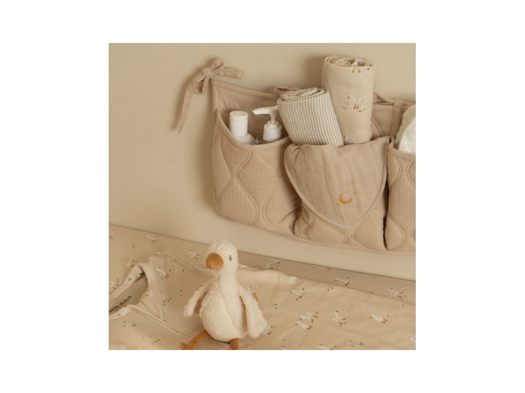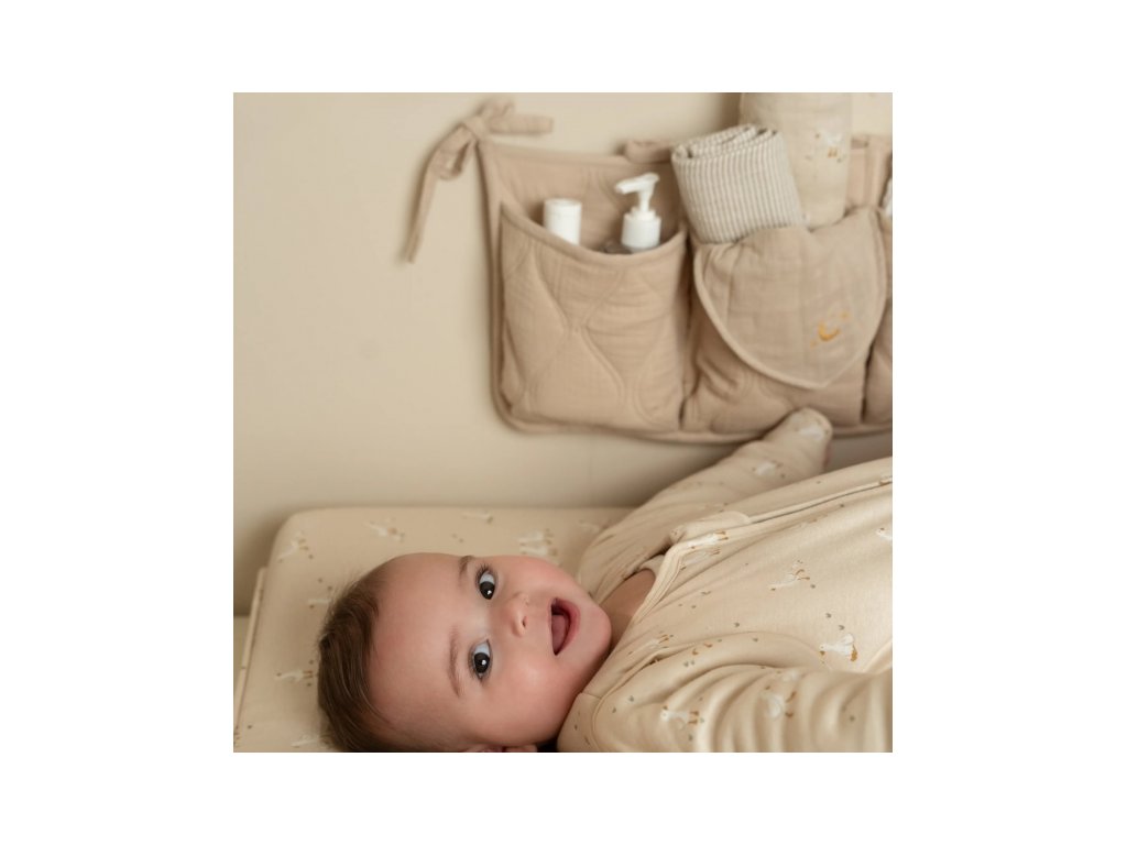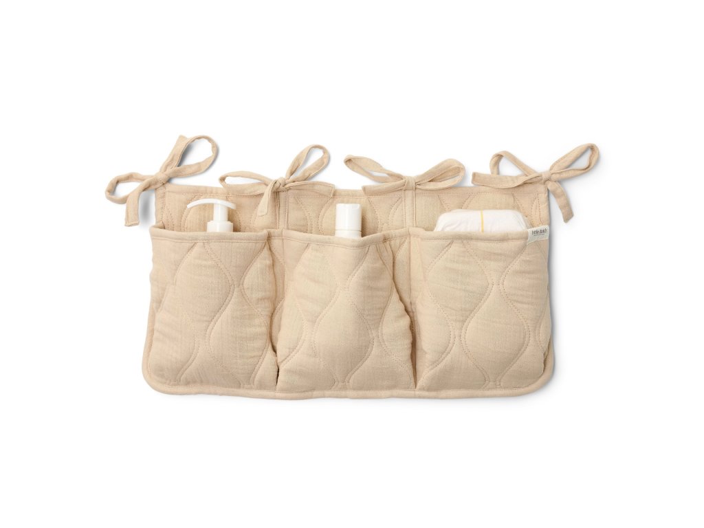 Praktický závěsný organizér v krásném provedení s ozdobným prošíváním vám umožní mít vše potřebné pro péči o vaše miminko vždy po ruce. Organizér ze 100% organické bavlny nabízí tři prostorné kapsy pro uložení dudlíků, bryndáčků, plen, ubrousků, hraček apod. Pomocí praktických vázacích šňůrek jej snadno připevníte k přebalovacímu pultu, na stěnu či na postýlku.