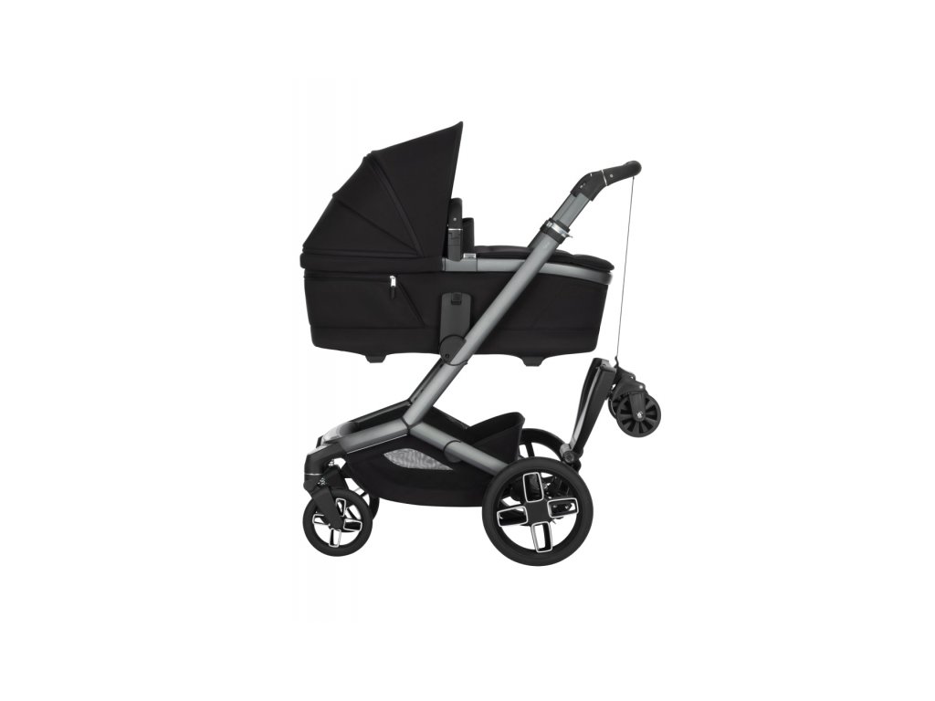 - když stupátko nepoužíváte, sklopíte jej nahoru a uchytíte přiloženým popruhem k rukojeti kočárku