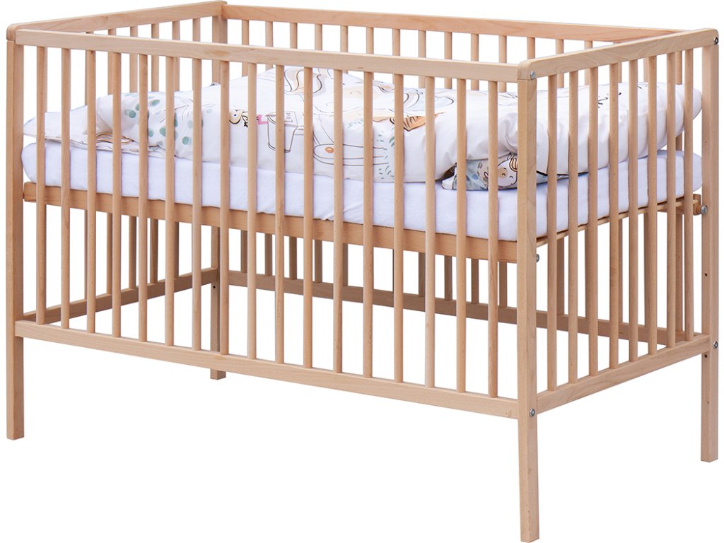 1 . Dětská dřevěná postýlka 120x60 cm - přírodní ECO, masiv, vyndavací příčky, 3 polohy roštu, nohy postýlky jsou předvrtané pro možné nasazení koleček