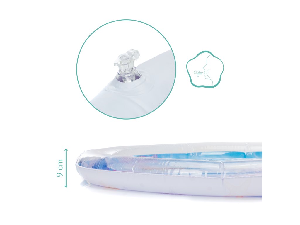Měkká plocha naplněná vodou a nafukovací okraj zajistí, že vaše miminko leží bezpečně a pohodlně. Uvnitř plavou barevné motivy, které se při každém pohybu mění a motivují dítě k uchopování, zkoumání a objevování hravou formou. Podložka navíc podporuje zrakové vnímání, koordinaci oko–ruka a rozvoj motoriky.