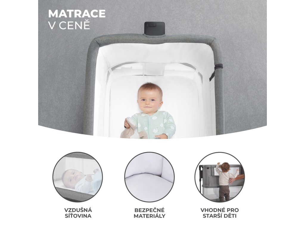 - Ve funkci přistýlky se na straně spuštěné bočnice nachází síťka. Díky tomu můžete mít dítě vždy na očích.