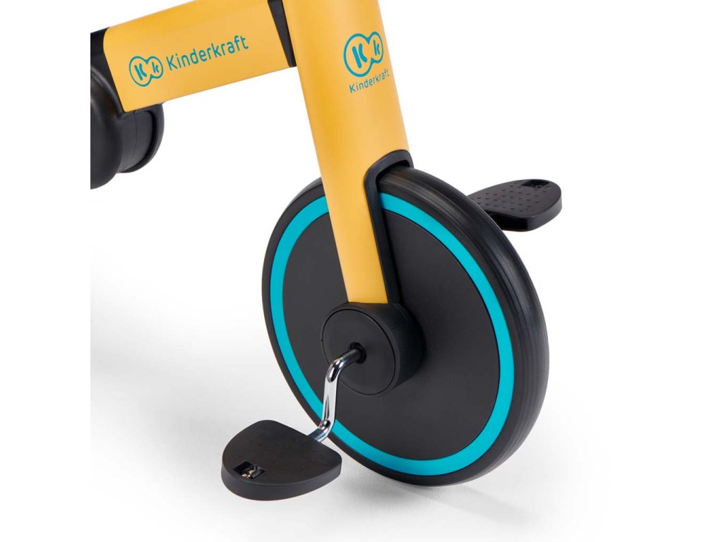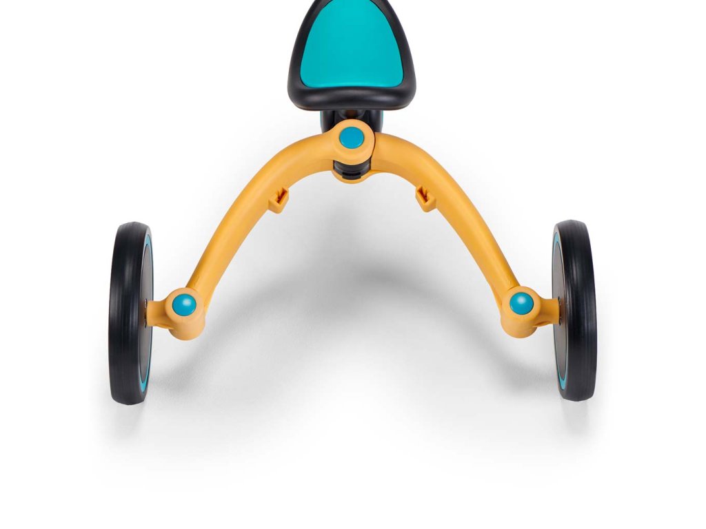 - tříkolka umožňuje jednoduchou a rychlou změnu funkcí. Kolečka stačí otočit a vzájemně spojit, až uslyšíte tiché „kliknutí“, a zablokovat pojistkou! Pro přeměnu odrážedla v tříkolku je nutné vytáhnout pojistku a rozložit nožičky.