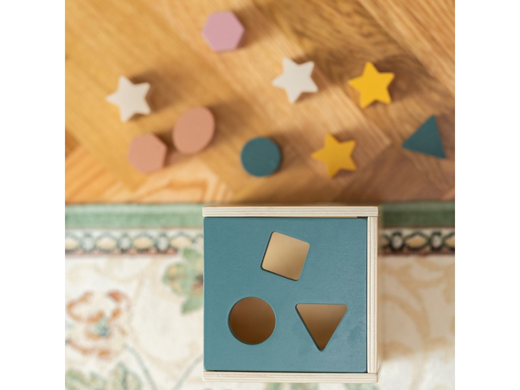 Souprava obsahuje dřevěnou kostku se čtyřmi stranami pro třídění a 12 barevných kostek různých tvarů, například trojúhelníku, hvězdy, čtverce, kosočtverce nebo kruhu.