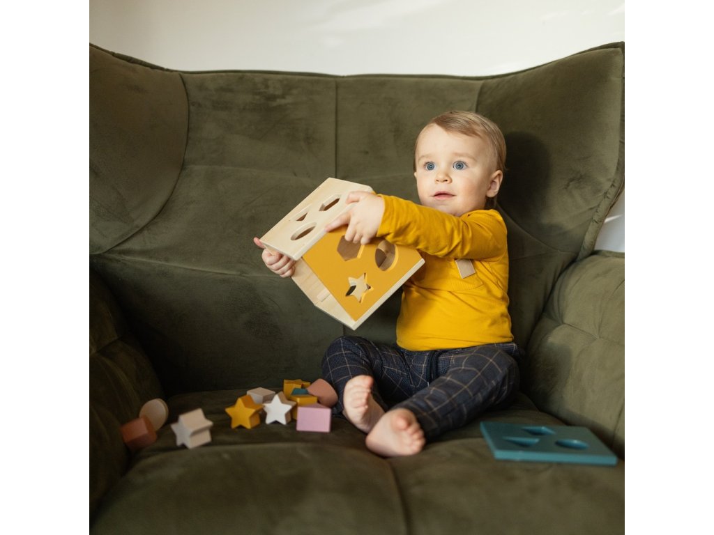 Když jsou všechny dílky uvnitř třídící kostky, jednoduše vysunete horní kryt, abyste je mohli snadno vyjmout zpět. Děti mohou nejen přiřazovat tvary k otvorům a třídit díly, ale také je používat ke stavbě různých prvků.