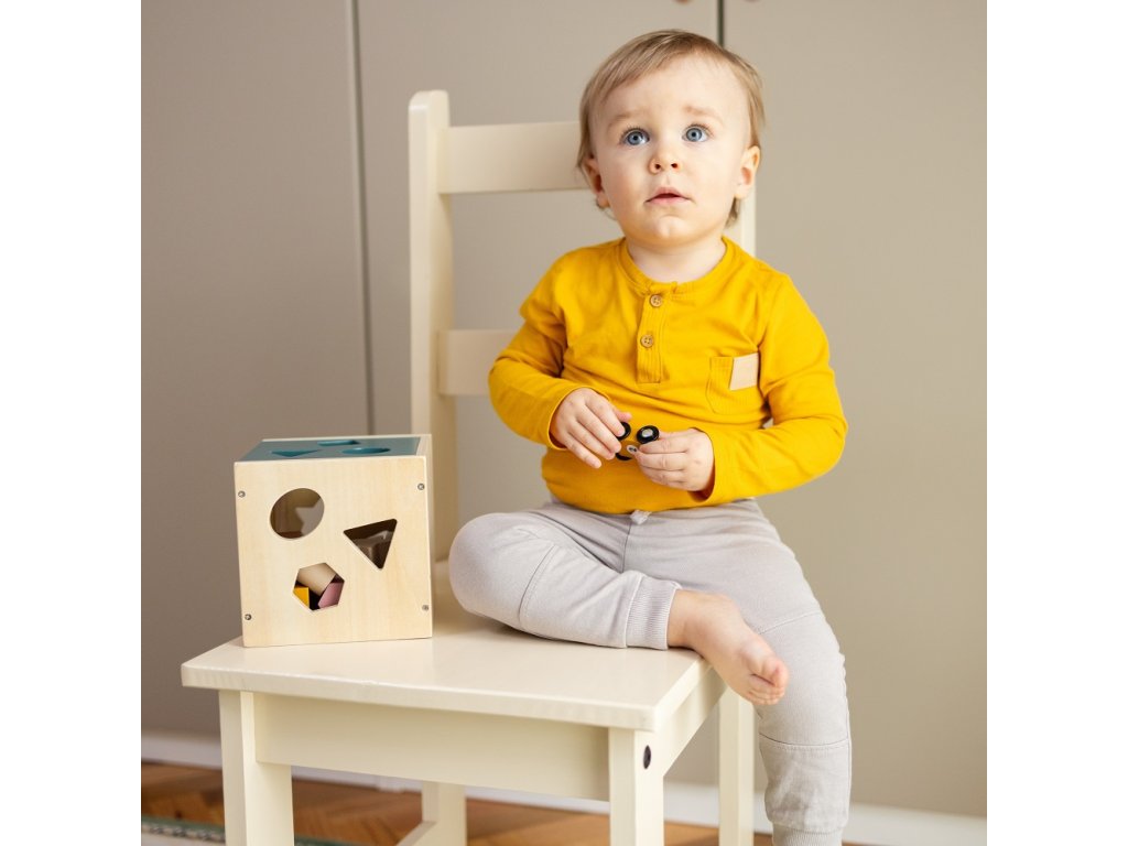 Hračka je určena pro děti od 1 roku. Souprava obsahuje třídící kostku a 12 barevných dílků. Každý prvek je pečlivě testován, odolný vůči házení a úderům, což zaručuje trvanlivost i během intenzivní hry.