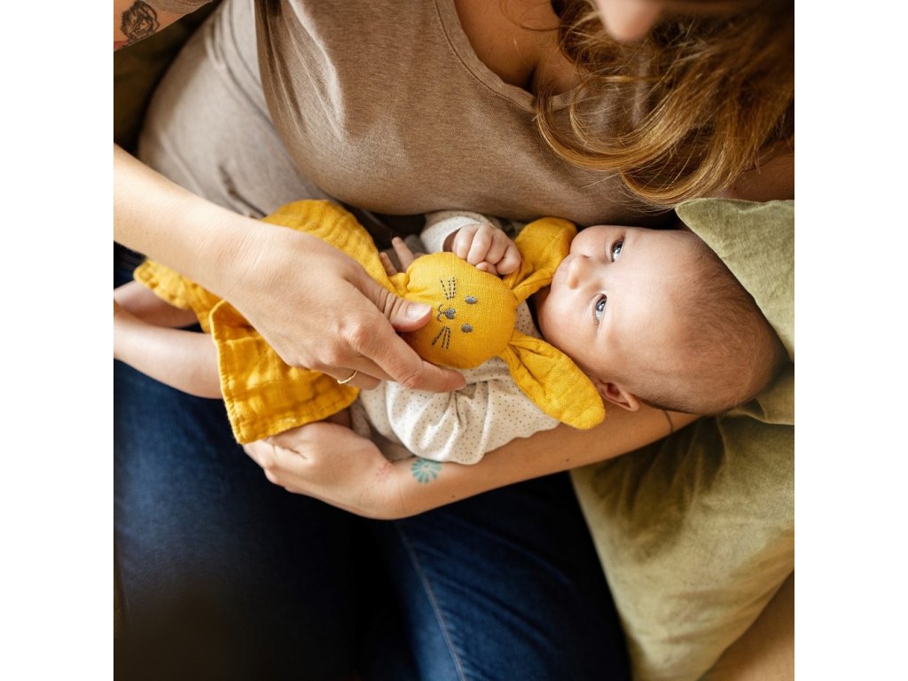 Měkoučký mušelinový zajíček Hugo má jednu tajnou zálibu. Nejraději ze všeho se vyvaluje v posteli a spí. Je to skvělý kamarád a hračka na spaní pro nejmenší dětičky. Hugo se rád tulí, přináší pocit tepla a něhy. S ním nikdo není sám. Je velmi příjemný a hebký na dotek, dokáže děťátko uklidnit po náročném dni.