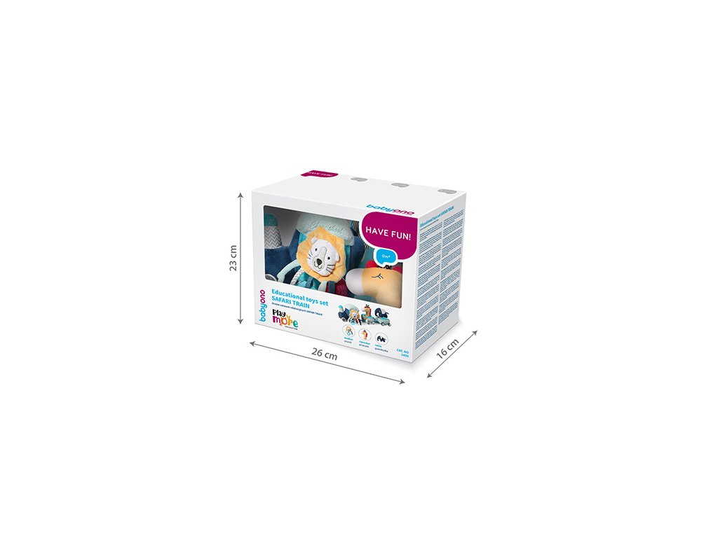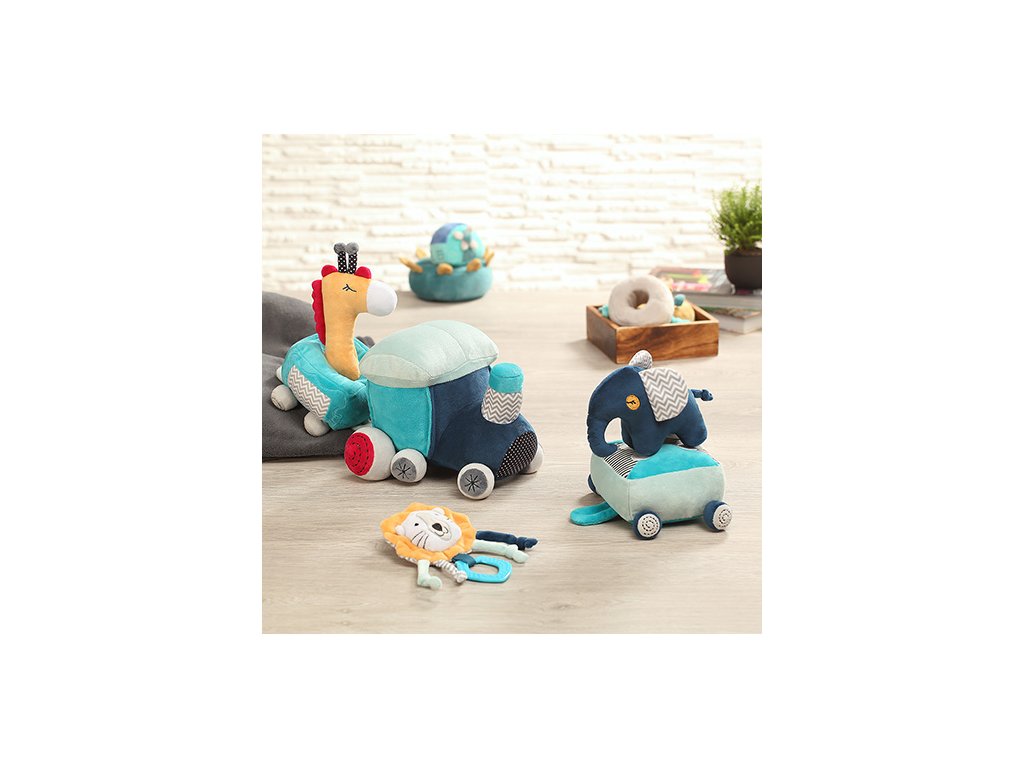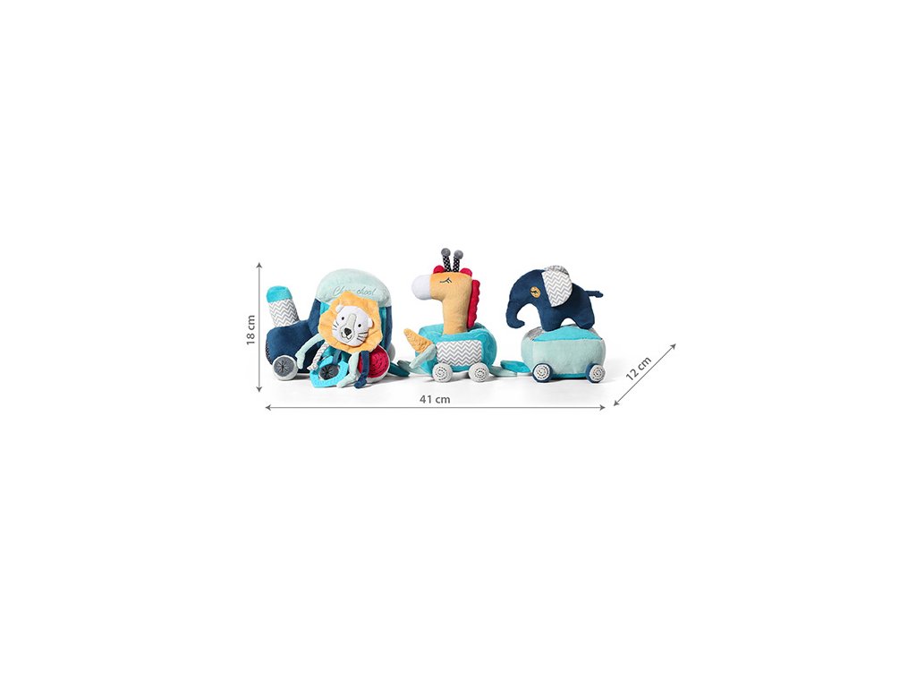- Prvky soupravy: vláček se dvěma vagóny, šustící kousátko ve tvaru lva, pískací hračka ve tvaru žirafy, chrastítko ve tvaru slona