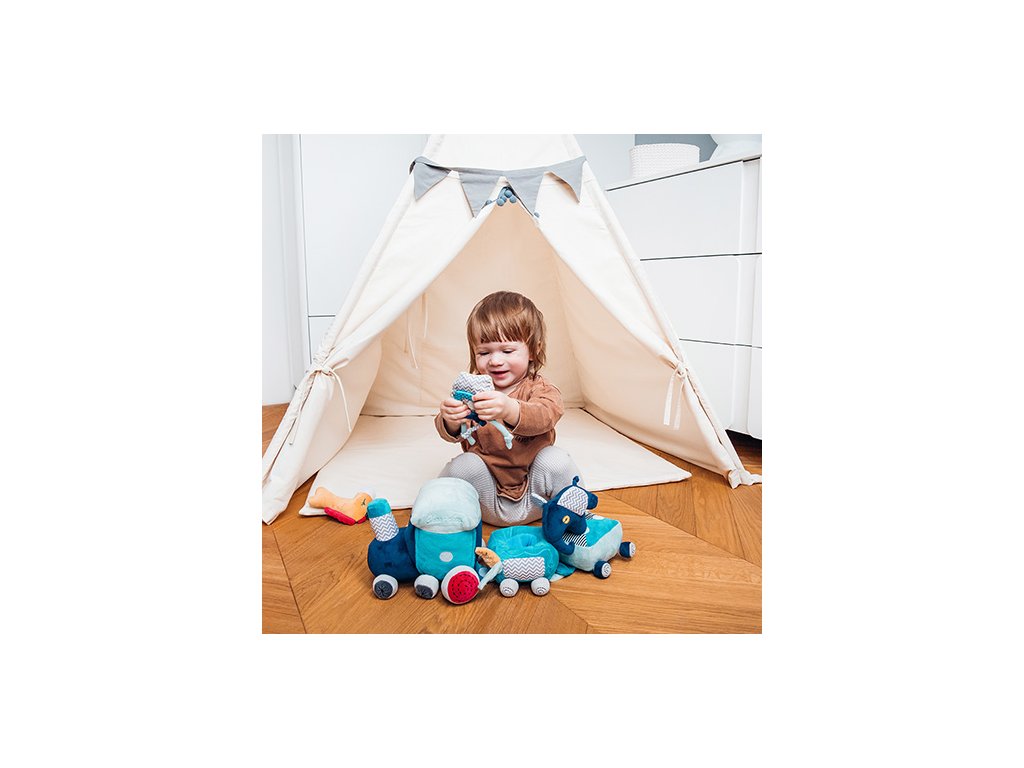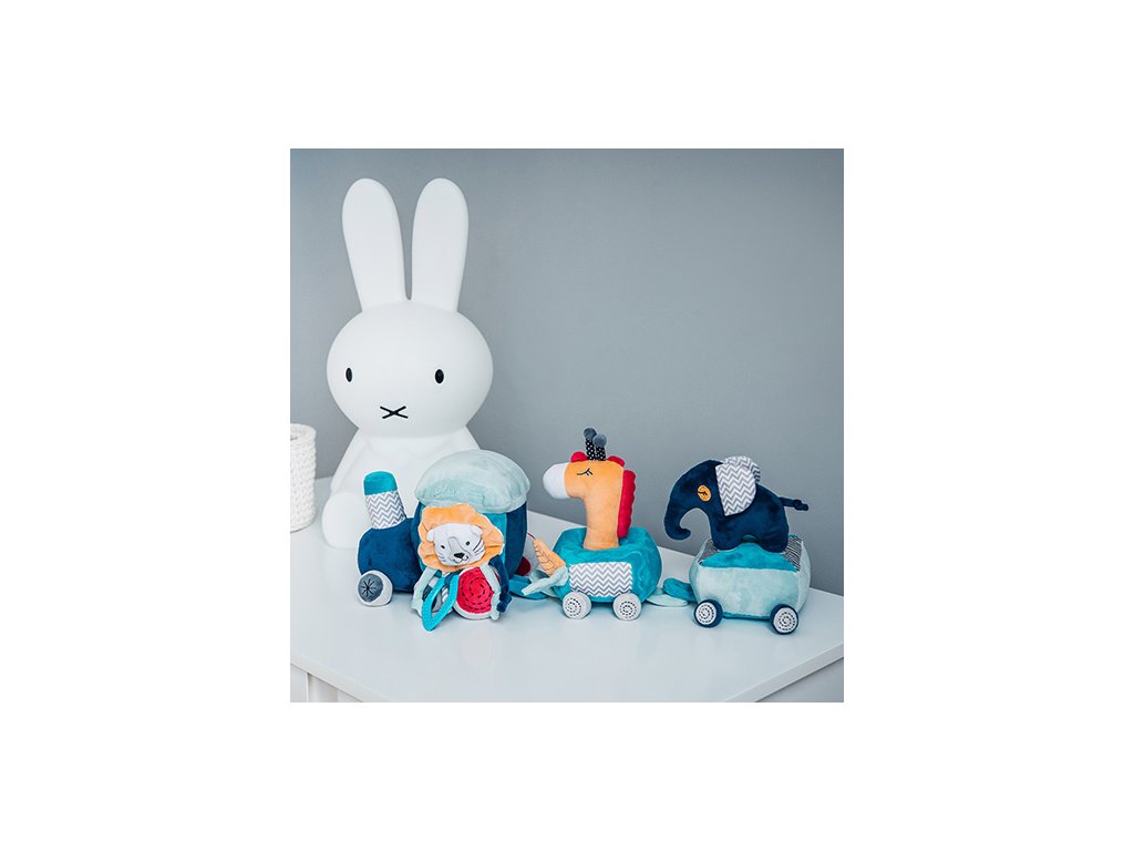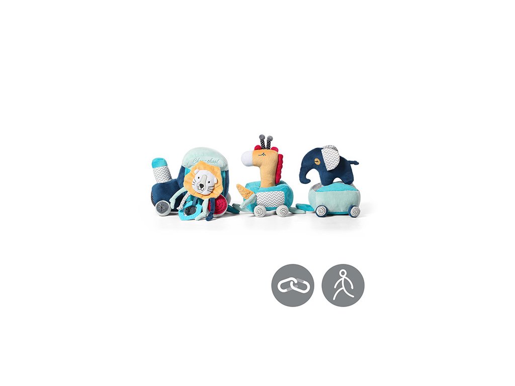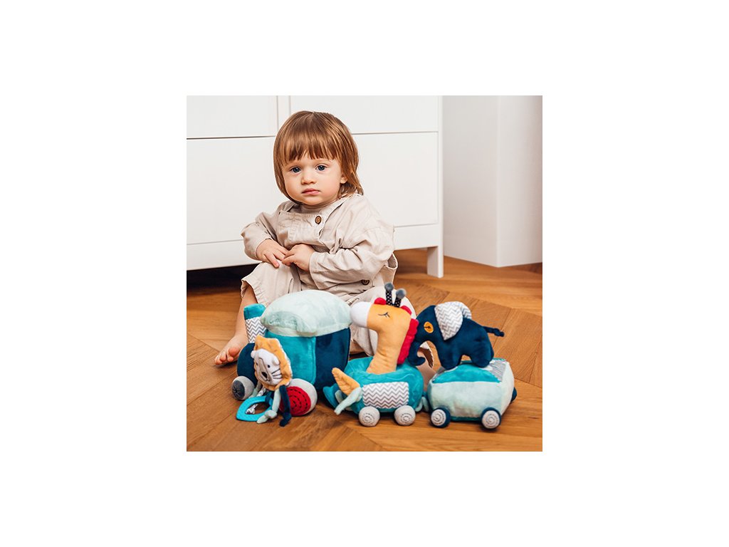 Vláčková sada vzdělávacích hraček Safari train se skládá z lokomotivy se dvěma vagóny a připojenými plyšovými hračkami: pískajícími, chrastícími a šustícími. Hračka seznamuje dítě s rozmanitým světem barev, zvuků a tvarů. Díky přichycení na suchý zip a důmyslně navrženým prostorům pro hračky lze vytvářet zajímavé kombinace, které podněcují kreativní myšlení.