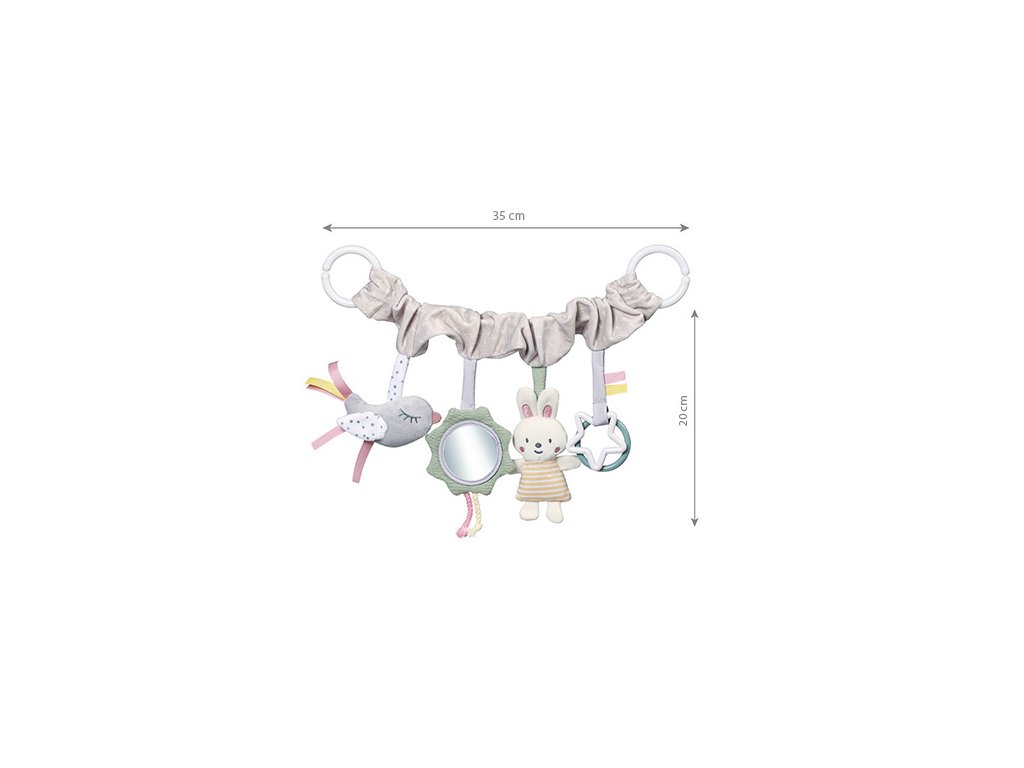 Závěsná hrazdička Nature do kočárku a autosedačky je senzorický produkt, který dokáže stimulovat hmat a zrak dítěte, jakož i zlepšit jeho motorické schopnosti. Vše, co musíte udělat, je připevnit ho na kočárek, kolébku nebo autosedačku, abyste dítě zabavili během procházek a cestování. Závěsný předmět potažený látkou příjemnou na dotek je dodáván s chrastícím ptáčkem, bezpečným zrcátkem a vyčnívajícími šňůrkami, šustícím zajícem, jakož prstenem a hvězdou. Pečlivě vybrané kousky jsou atraktivní a upoutají pozornost dítěte. Váš prcek si může hrát, objevovat svět a rozvíjet své oči a sluch.