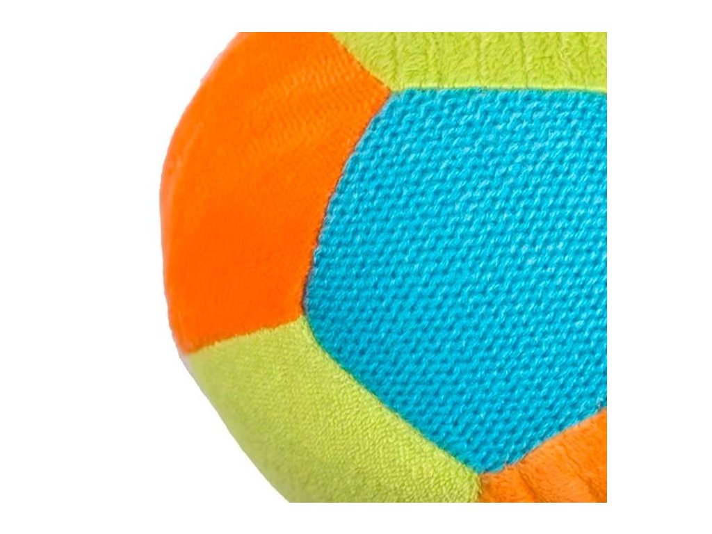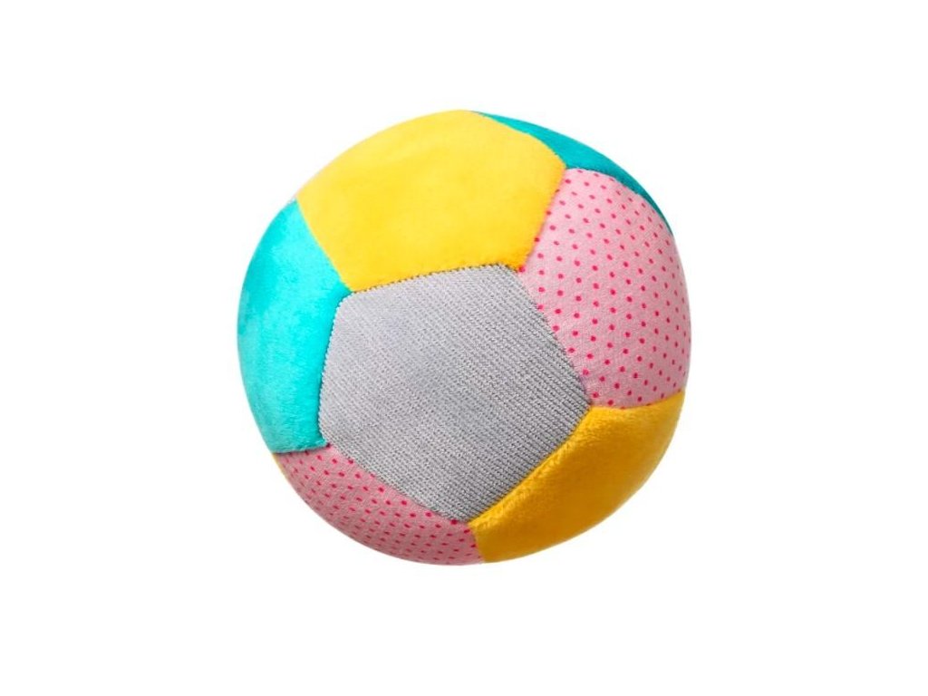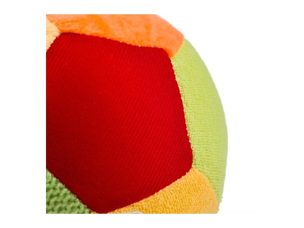 Pestré, kontrastní barvy uspořádané do geometrických pětiúhelníků zaměřují vidění dítěte a pomáhají rozlišovat barvy. Jemný zvuk zvonku uvnitř hračky podporuje hraní. Měkkost míče podporuje její uchopení a přesunutí z jedné ruky do druhé.