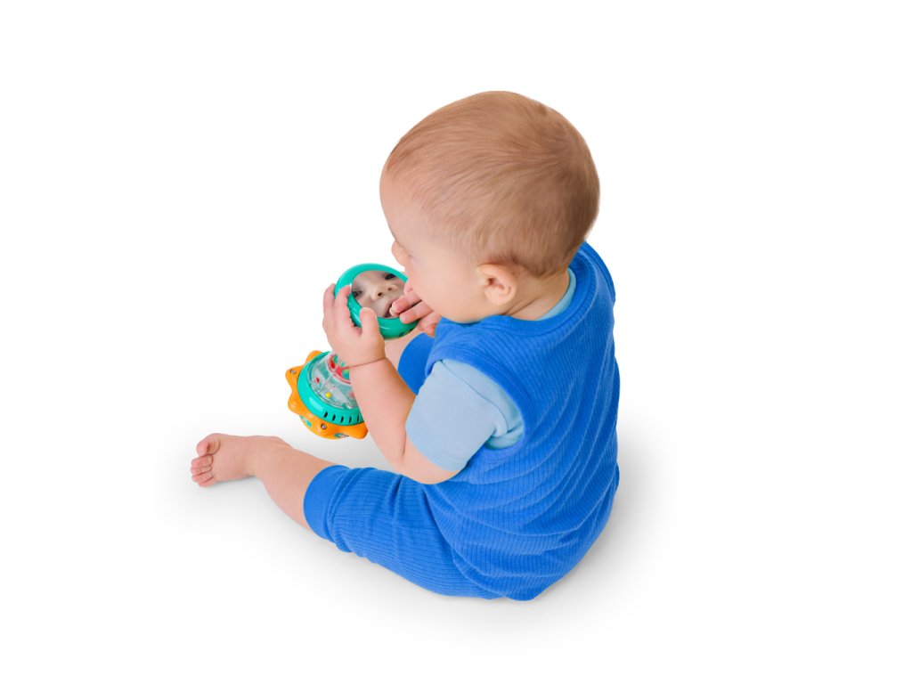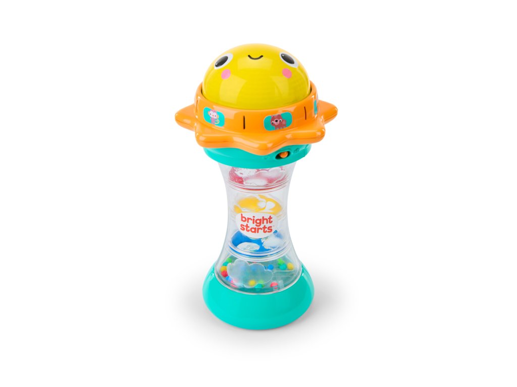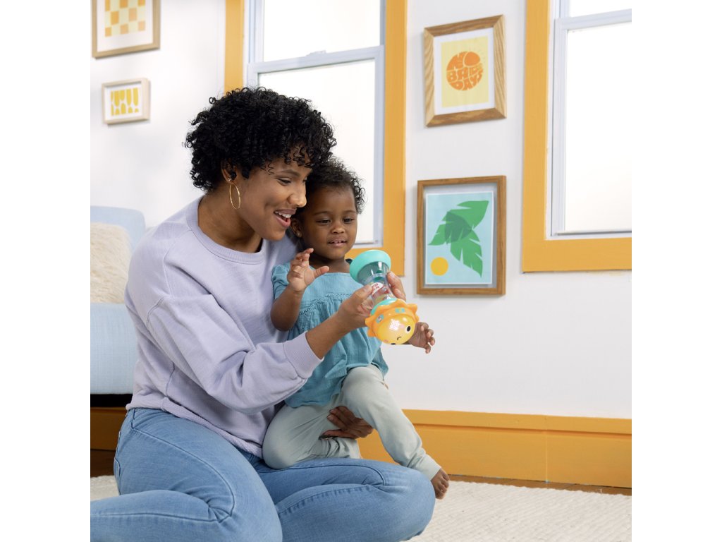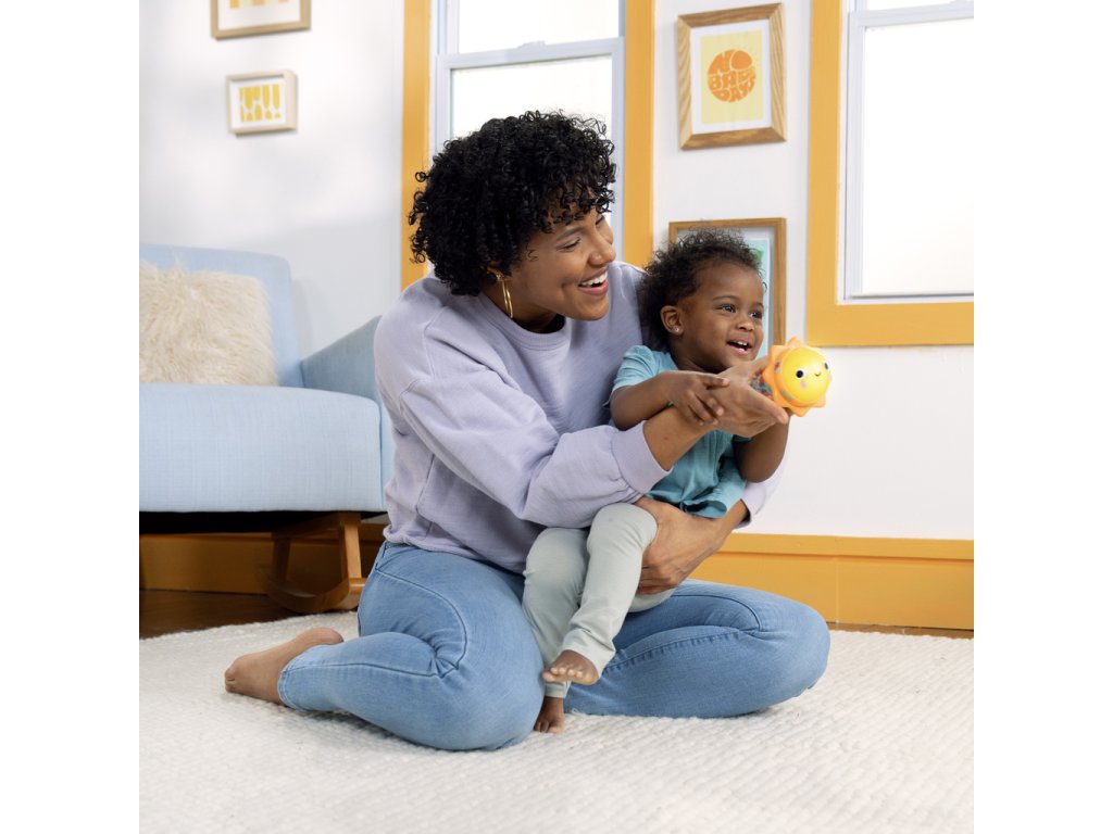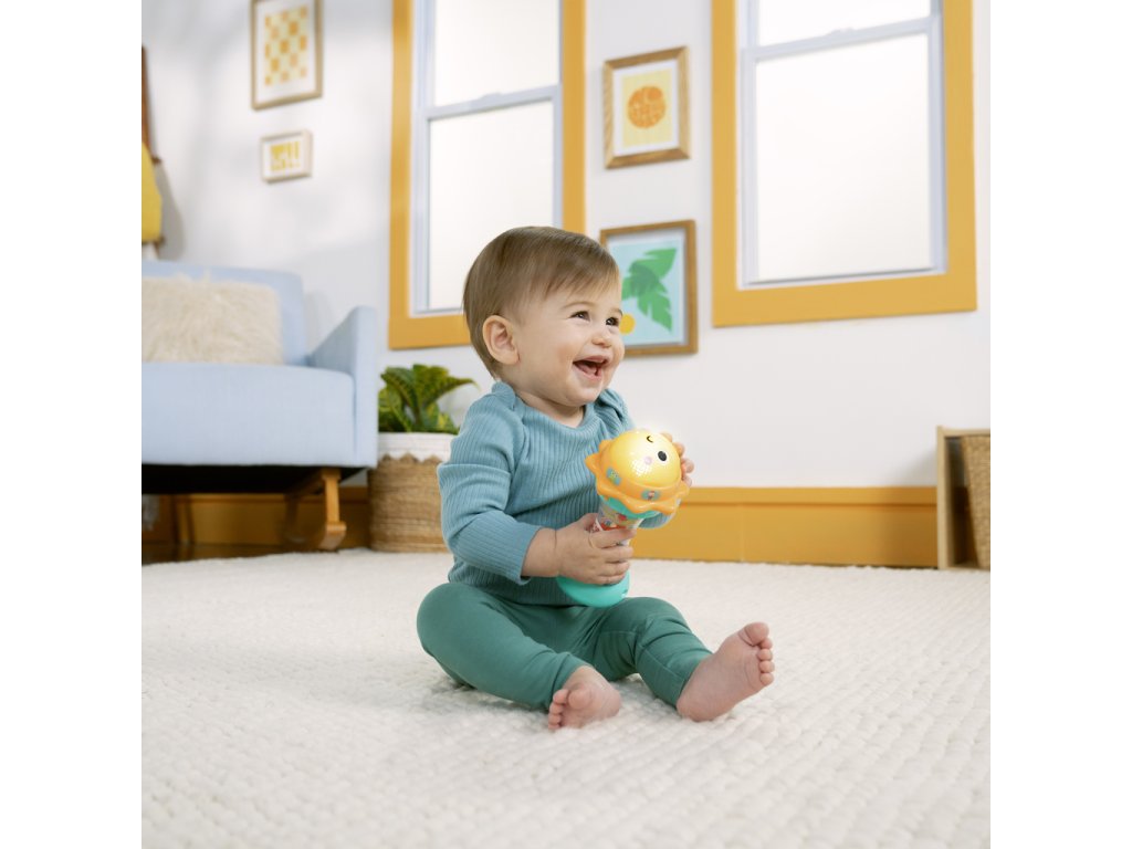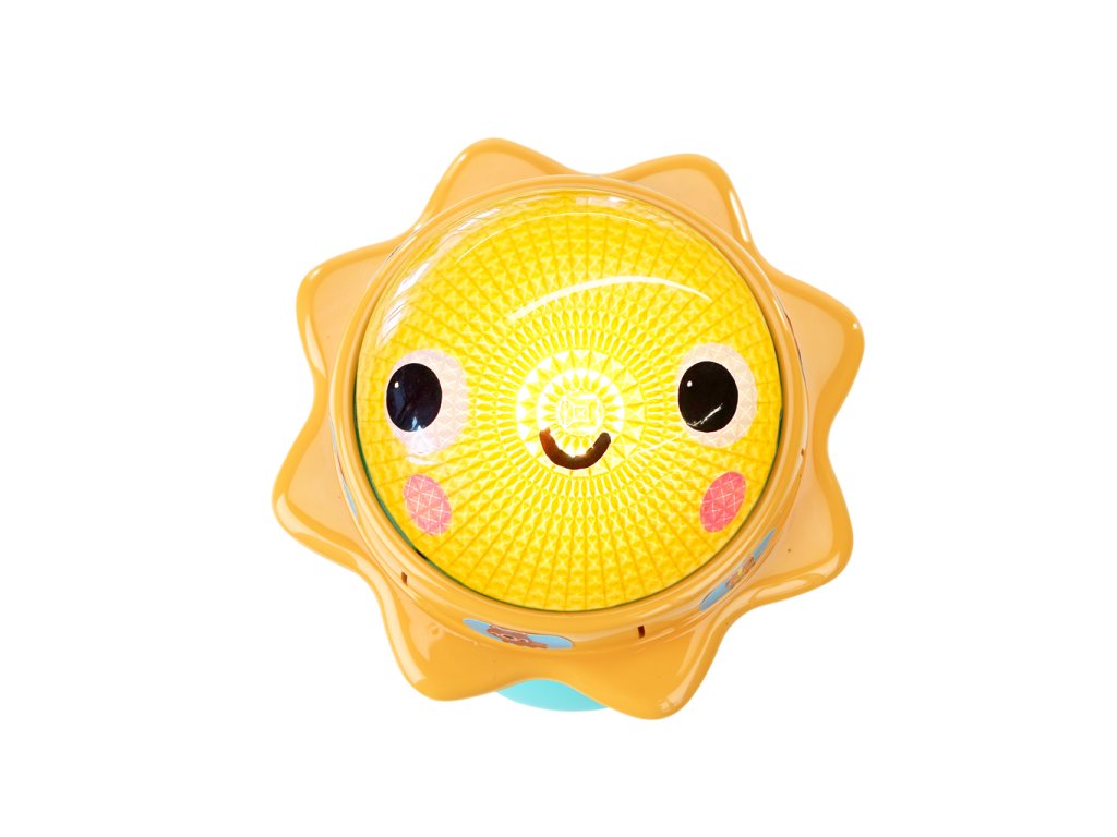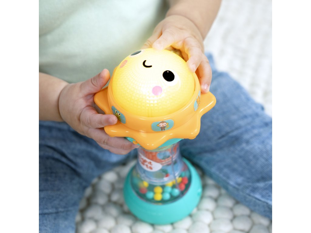 Svítící hračka zabaví miminko veselými světly, zvuky zvířátek a chrastícími kuličkami. Otáčej sluneční kopuli, která svítí, a objev více než 30 melodií a zvuků – od mňoukání, přes rýlení až po kvákání a další. Při potřesení se kuličky uvnitř rozkutálejí jako kapky deště, čímž dítě získává další vizuální i zvukovou stimulaci. Spodní strana hračky skrývá zrcátko, které podporuje vnímání vlastního odrazu a sebeobjevování. Tato interaktivní hračka pomáhá dětem pochopit princip příčiny a následku a je ideálním společníkem na doma i na cesty.