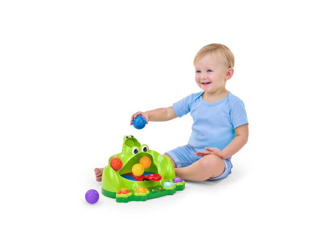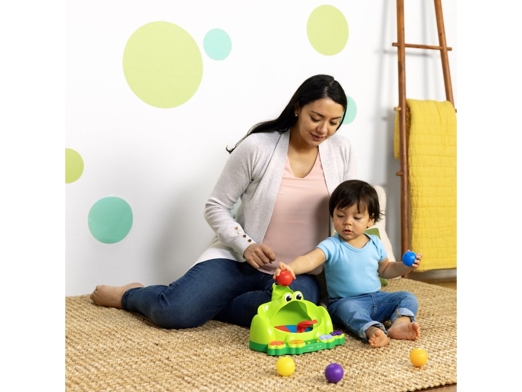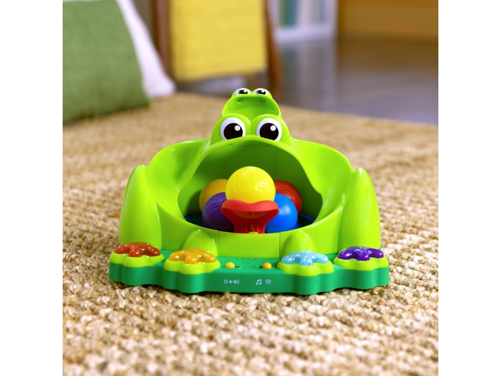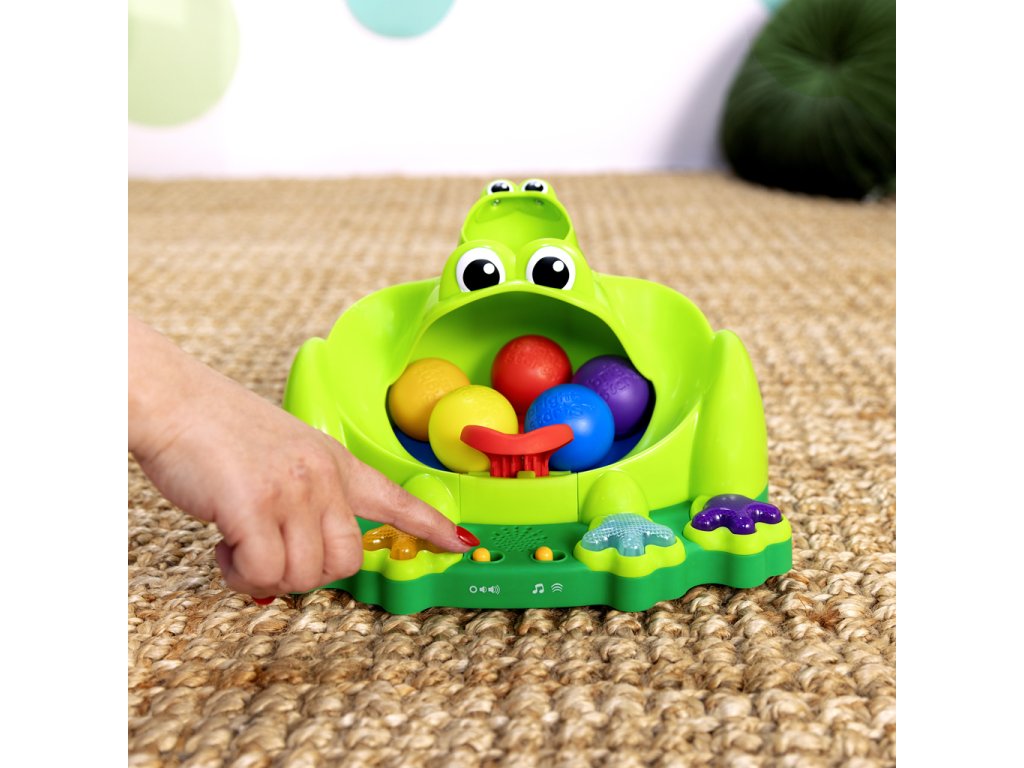 - Stiskněte jednu ze 4 barevných nohou žabky a aktivujte světla a 50+ melodií/zvuků; žabí ústa mají zabudovaný trampolínový mechanismus, který zachycuje skákající míčky během hry