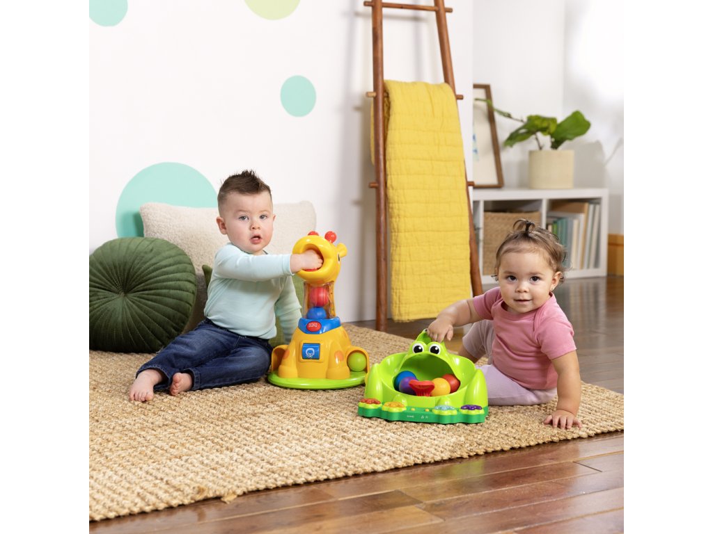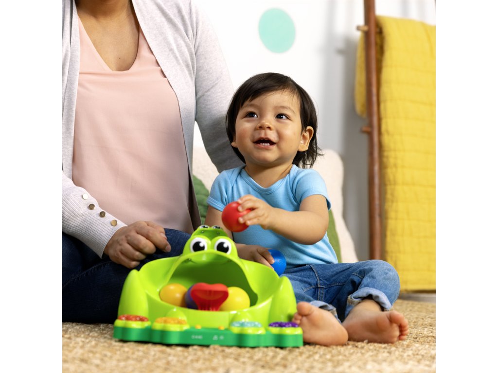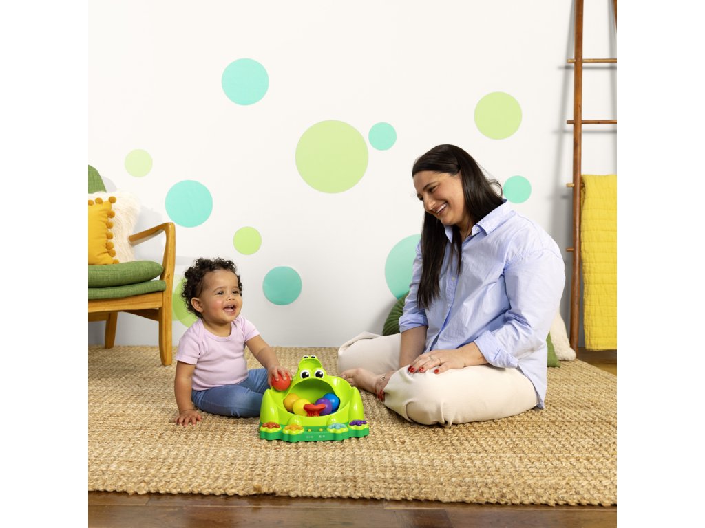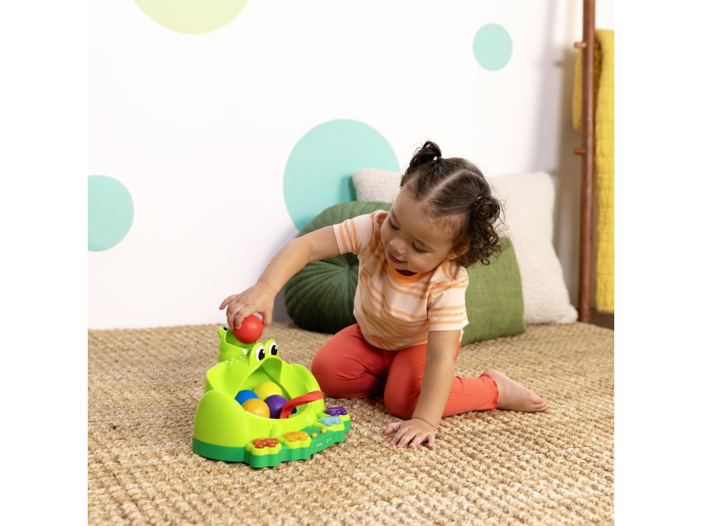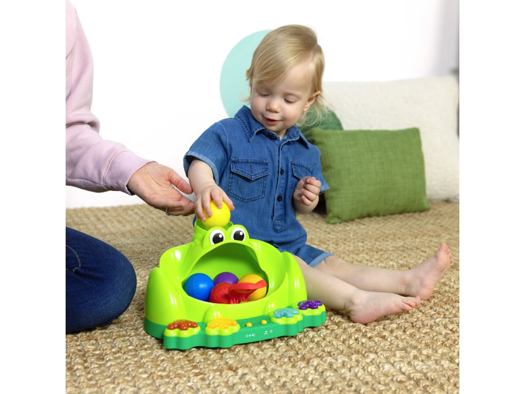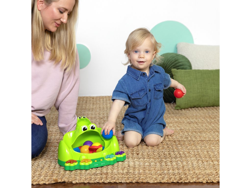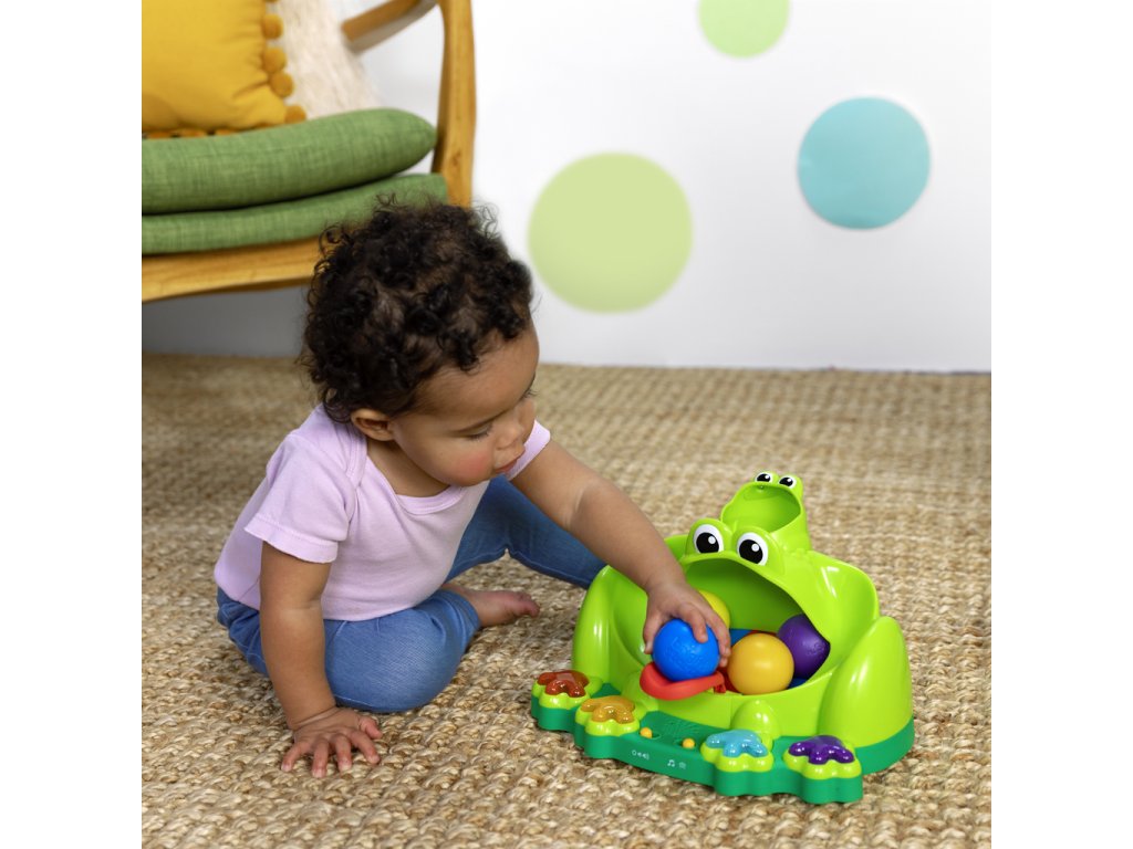 Hračka Poppin' Ball Frog přináší nekonečný smích a zábavu se svými skákajícími míči, hravými světly a zábavnými zvuky. Podporuje plazení, když se dítě snaží dohnat míčky! Nakrmte přátelského žabáka jedním z 5 míčků a sledujte jak skáčou na zabudované trampolíně v jeho ústech. Žabák baví děti čtyřmi způsoby hry – házení, vystřelování, kutálení a mačkání – tato interaktivní hračka podporuje učení příčiny a následku, přičemž zabaví dítě na celé hodiny. Navržena pro děti od 6 měsíců je ideálním doplňkem do vaší sbírky dětských hraček. Hra s míči je osvědčený způsob jak děti a batolata rozvíjejí své schopnosti, zatímco se skvěle baví. Skvělá hračka na darování při příležitostech jako narozeniny, svátky nebo jen tak – tento žabí kamarád si jistě získá srdce vašeho dítěte! Snadno se udržuje v čistotě pomocí vlhkého hadříku a jemného mýdla.