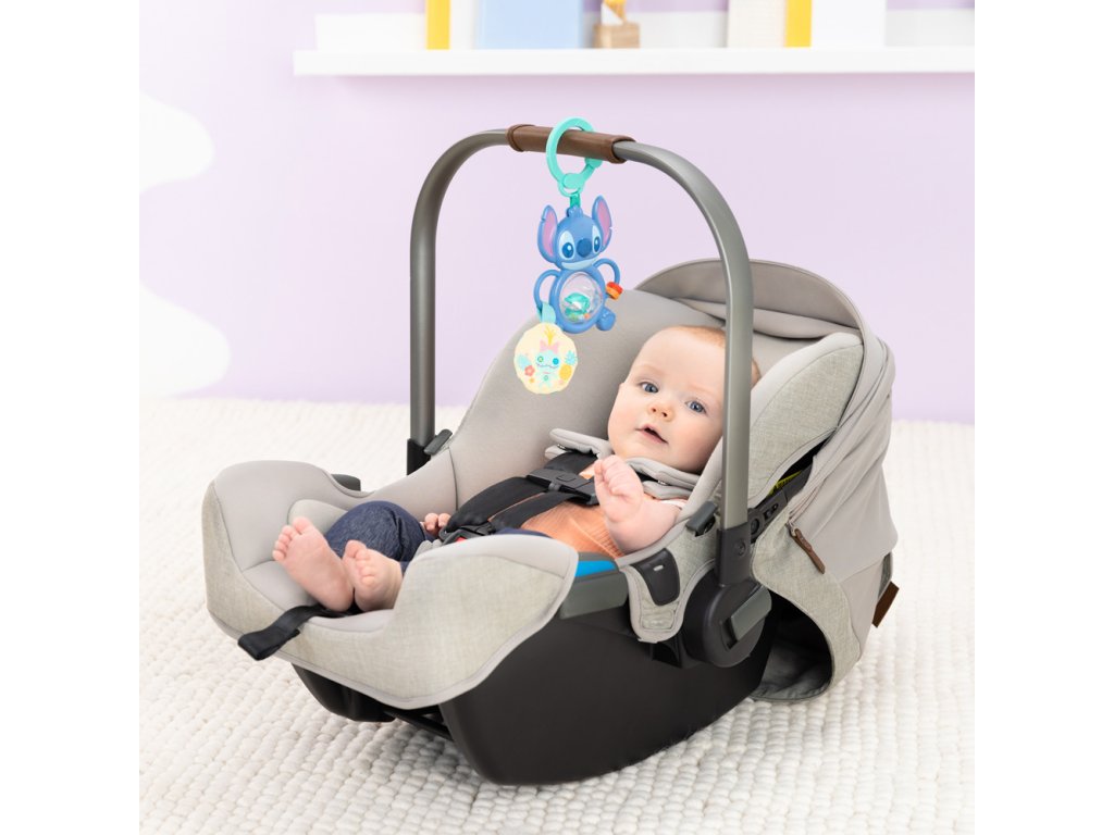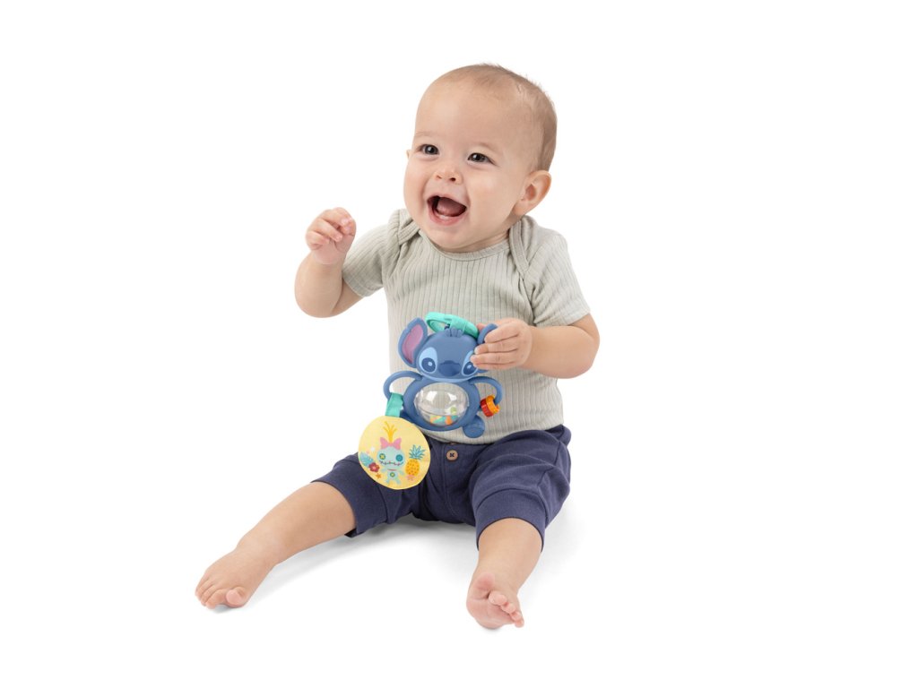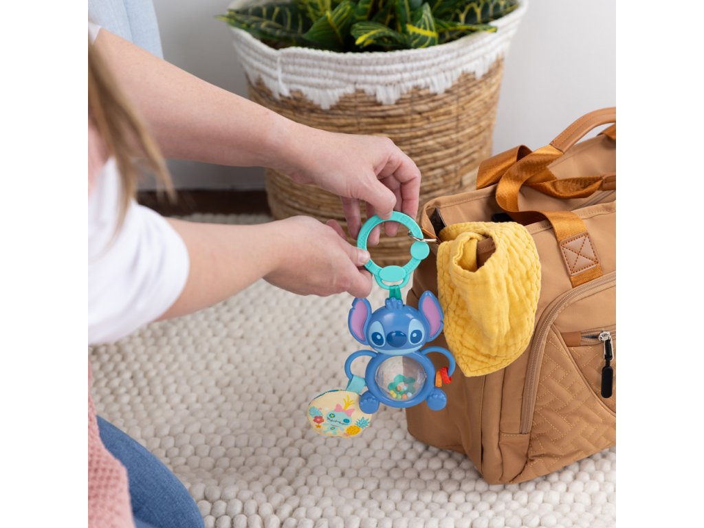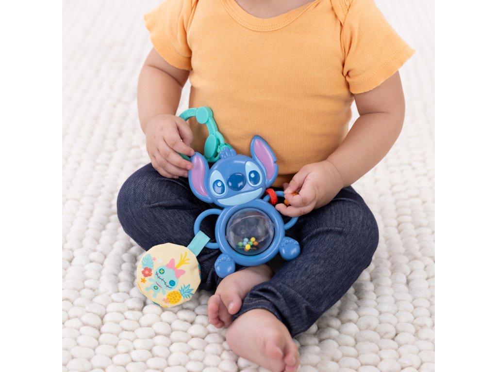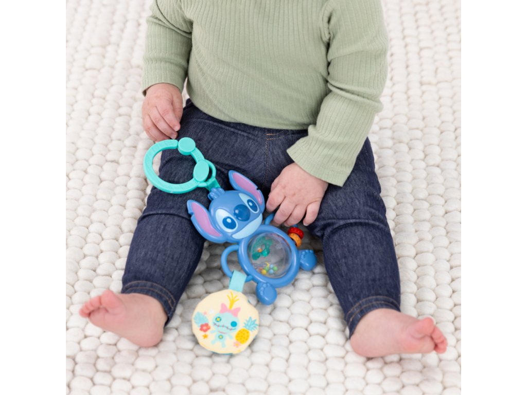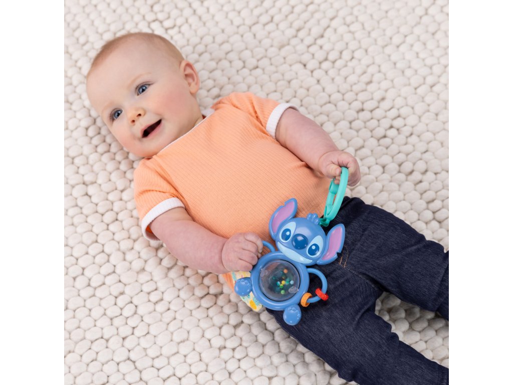 Dopřejte svému miminku nekonečnou zábavu s rozkošným Stitchem! Interaktivní hračka, která podporuje vývoj smyslů a jemné motoriky již od nejútlejšího věku. Otočte váleček v bříšku a sledujte, jak se barevné korálky víří uvnitř – tato kombinace pohybu, barev a zvuku podněcuje zrak i sluch. Posunujte korálky po Stitchově rukojeti pomocí uchopitelné rukojeti a rozvíjejte při tom jemnou motoriku. Měkký plyšový kruh s ručně robenou panenkou vydává šustící zvuky, které stimulují hmat a sluch. Díky C-kroužku se hračka jednoduše připevní ke kočárku nebo autosedačce – ideální na cesty či procházky. Je lehká, skladná a vhodná pro kluky i holky od narození.