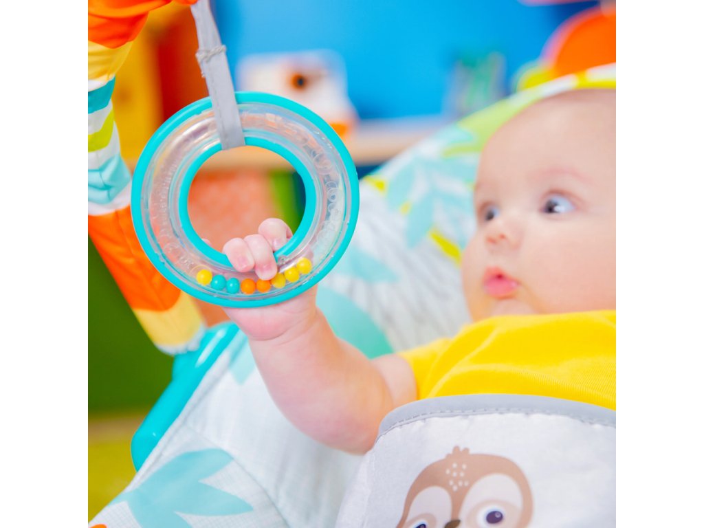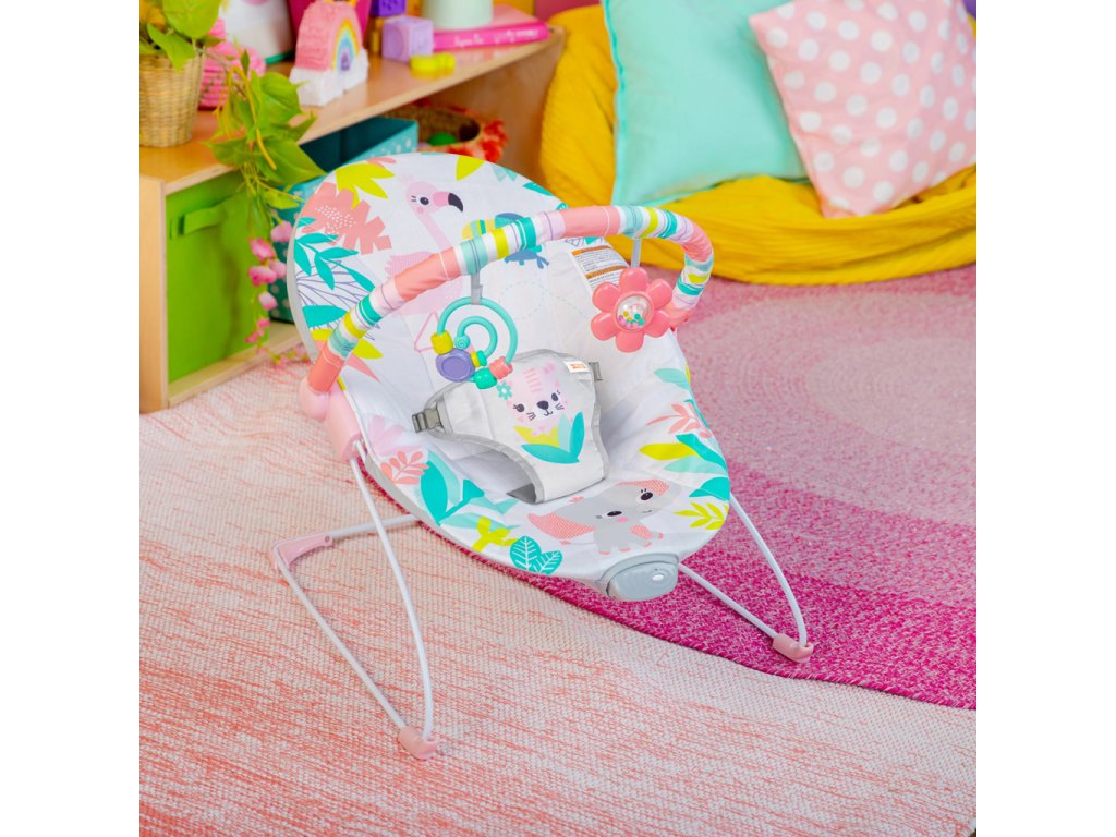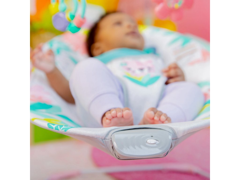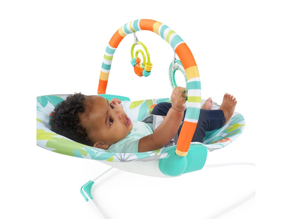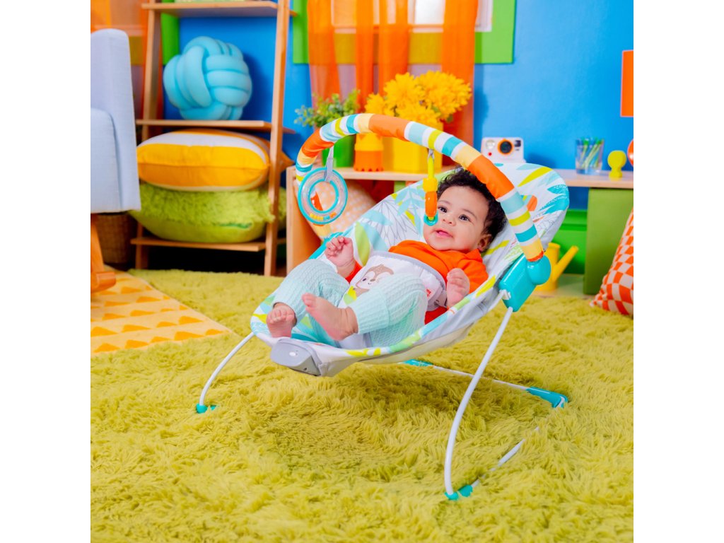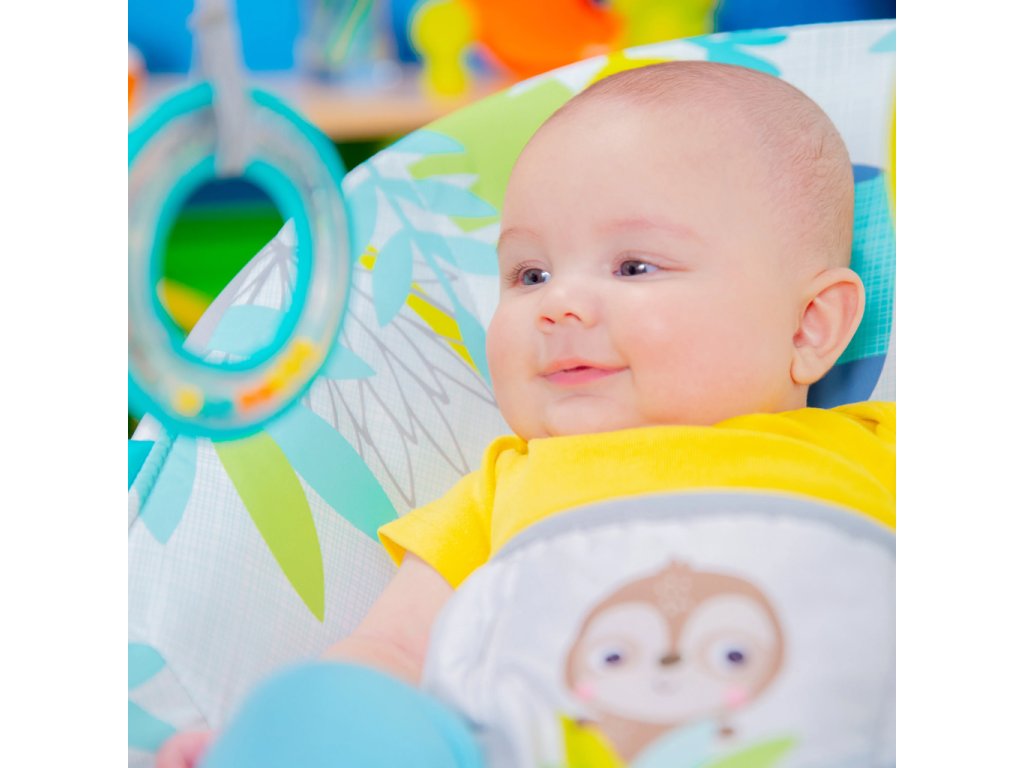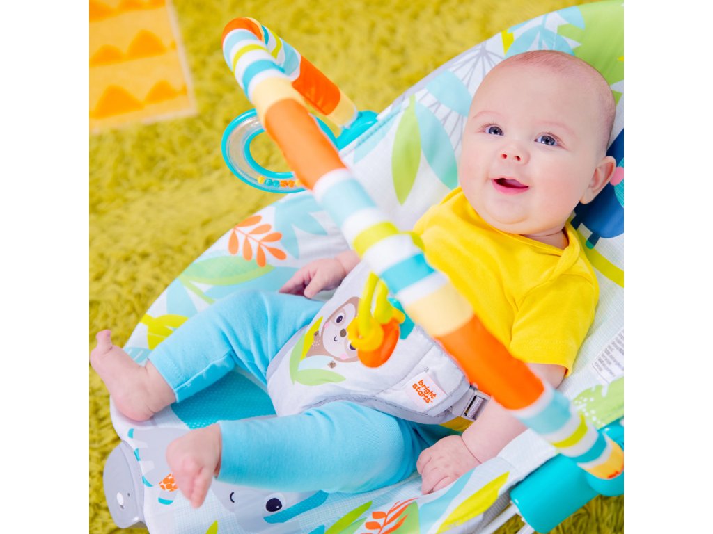 Vibrační lehátko Rainforest Vibes od Bright Starts je tím nejdivočejším místem k sezení a hraní! Připravte se na široké úsměvy, když se vaše miminko začne natahovat za dvěma barevnými hračkami visícími shora. Vaše malé děťátko si zamiluje klikání a chrastítko s korálky.