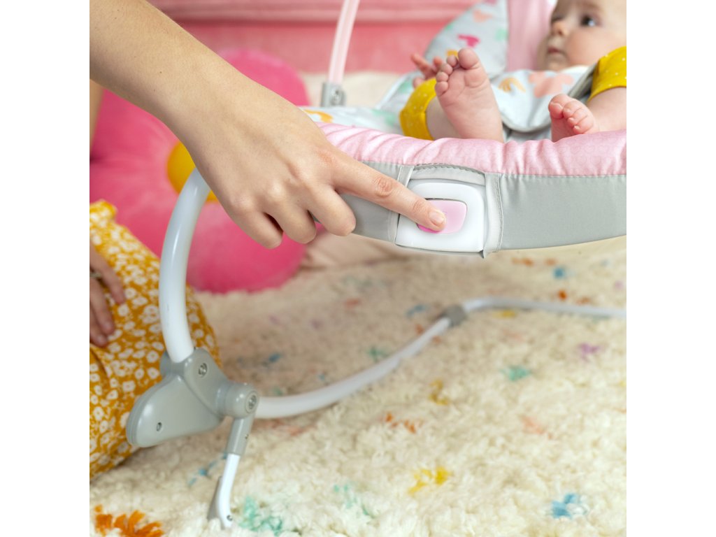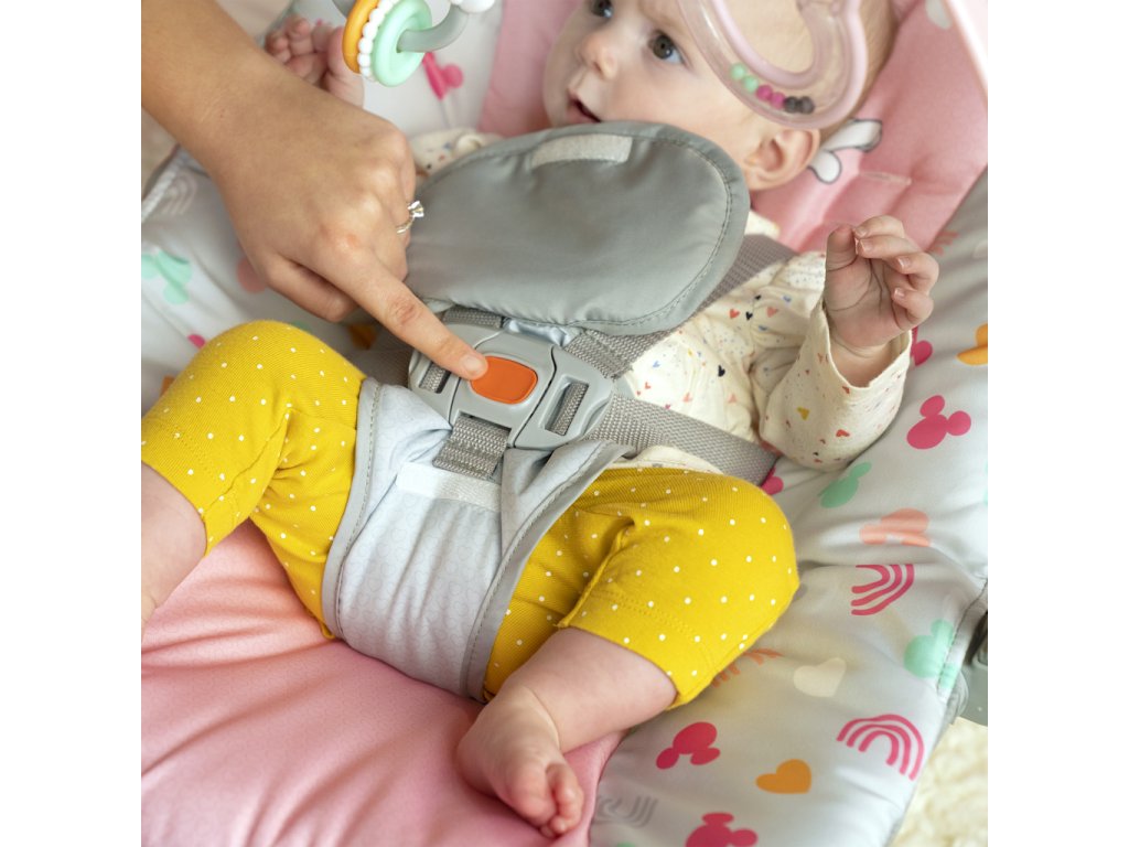 Houpátko má všechny utišující funkce, které vaše děťátko potřebuje – jako utišující vibrace, hluboké sedátko a samozřejmě zábavu s hračkami, které visí z hrazdičky. Odnímatelná hrazdička nabízí vašim dětem hru s hračkami inspirovanými Minnie Mouse. Sedací část je lehce omyvatelná a můžeme ji vložit do pračky. Neklouzavé nožičky a 5-bodový bezpečnostní pás udržuje dětskou bezpečnost po celou dobu zábavy vašeho miminka. Houpátko obsahuje ze zadní strany výsuvné nožičky, které umožňují stabilizovat houpátko do stojící polohy.