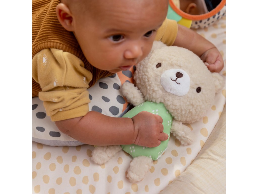 Dřevěná odnímatelná hrazdička obsahuje 5 různých hraček, které nabízejí děťátku plno zábavy. Dokonce si je snadno mohou vzít kamkoli s sebou. Dvě plyšové hračky medvídek a slůně, dřevěný kroužek se senzorickou stužkou a dvě zrcadlové hračky podporující sebe-objevování děťátka.