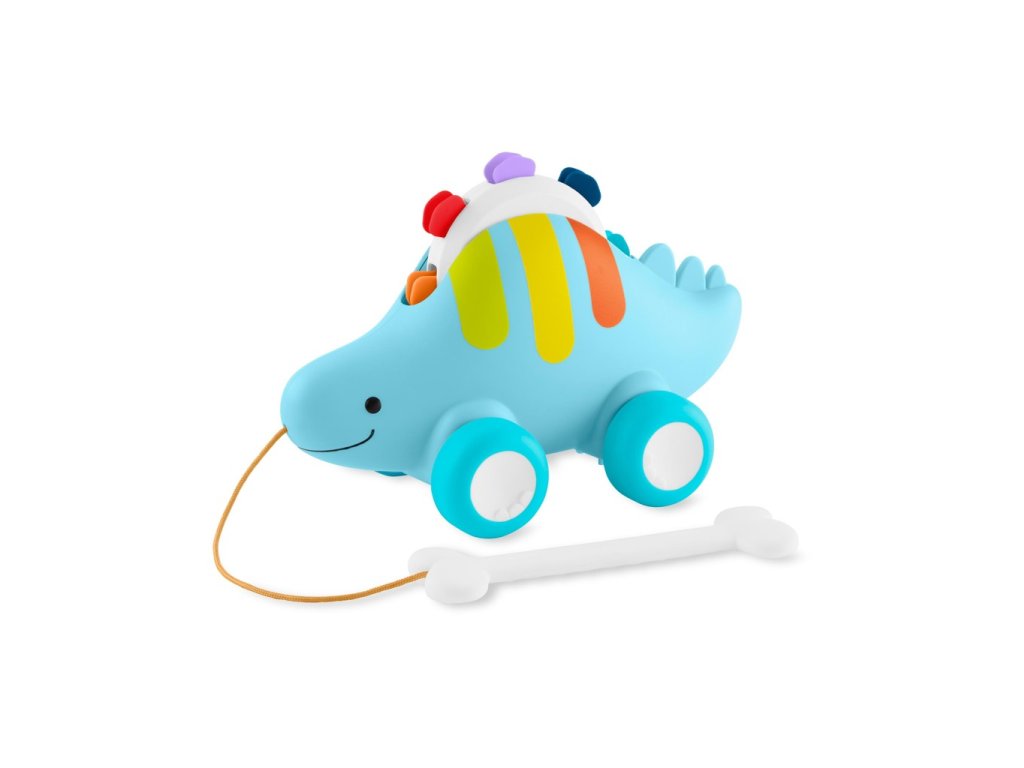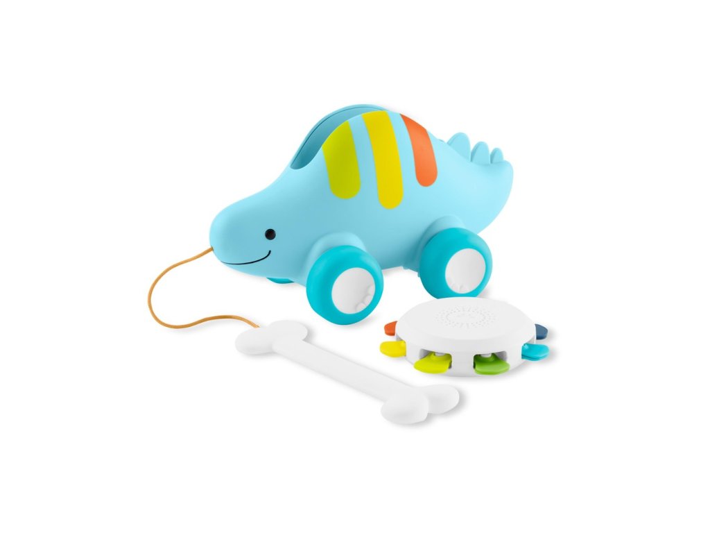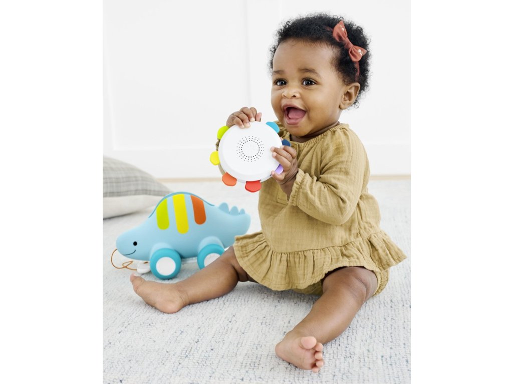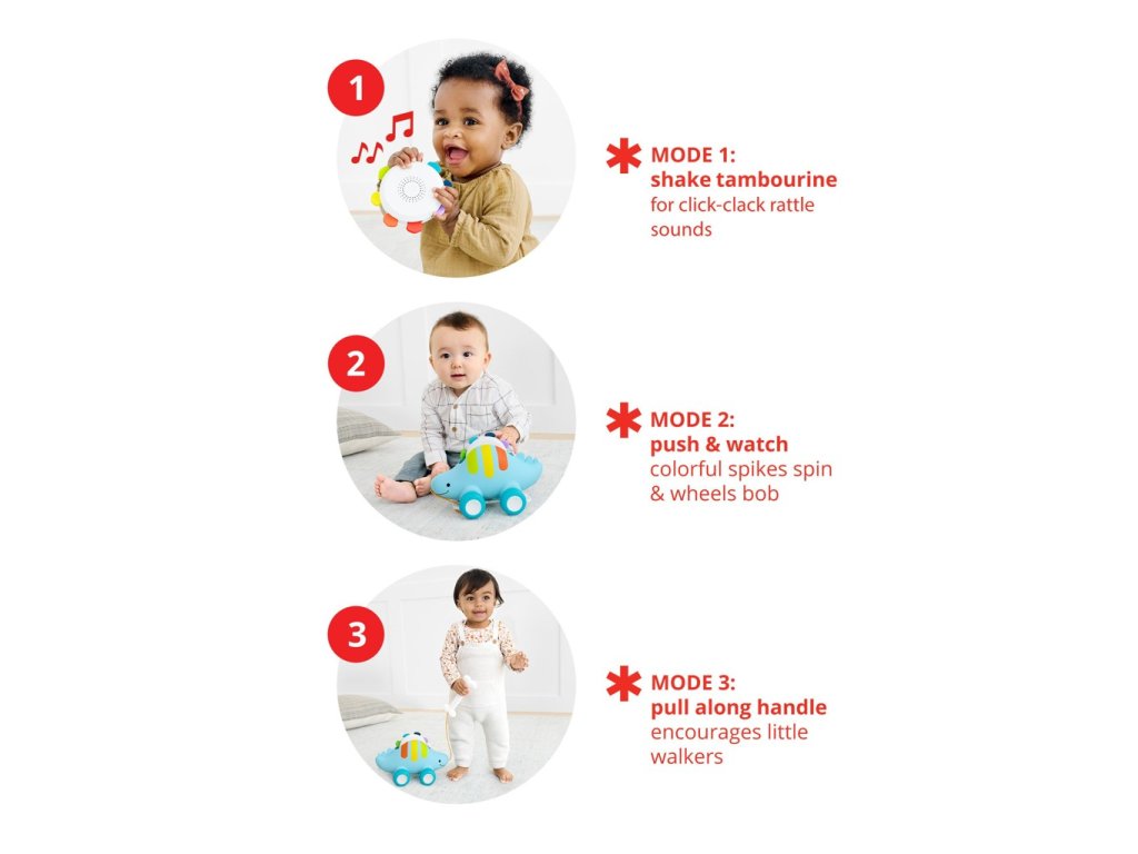 Náš rozkošný třesoucí se stegosaurus díky třem režimům hry – tamburína, tlačící hračka a tahací hračka roste spolu s dítětem, od sedícího až po chodící. Odnímatelná tamburína se malým ručičkám snadno sama třese. Nebo položte tamburínu na záda dinosaura, zatlačte na ni a sledujte, jak se hroty otáčejí, zatímco se kola otáčejí nahoru a dolů. V režimu připojená „kostová“ rukojeť povzbuzuje malé chodce, aby s sebou vzali svého zábavného dino kamaráda na procházku.