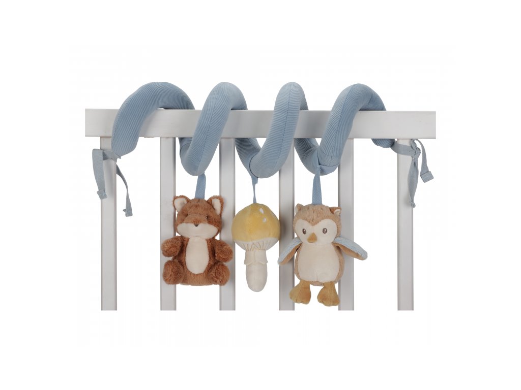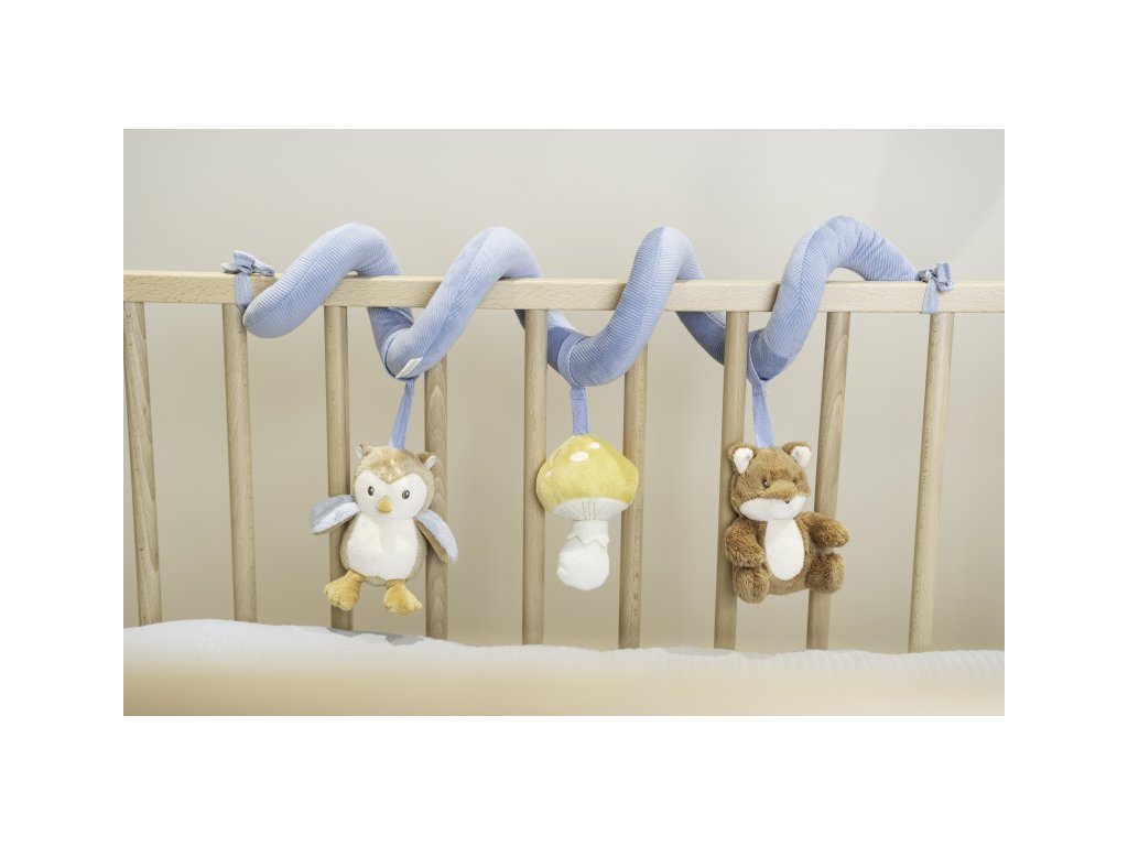 Textilní spirála se zavěšenými hračkami v podobě lišky, sovy a houbičky zabaví vaše miminko v postýlce, kočárku i v autosedačce. Měkké hračky vyrobené z jemného plyše chrastí, šustí a nabízí různé textury pro zkoumání. Hračky stimulují koordinaci ruka / oko dítěte.
