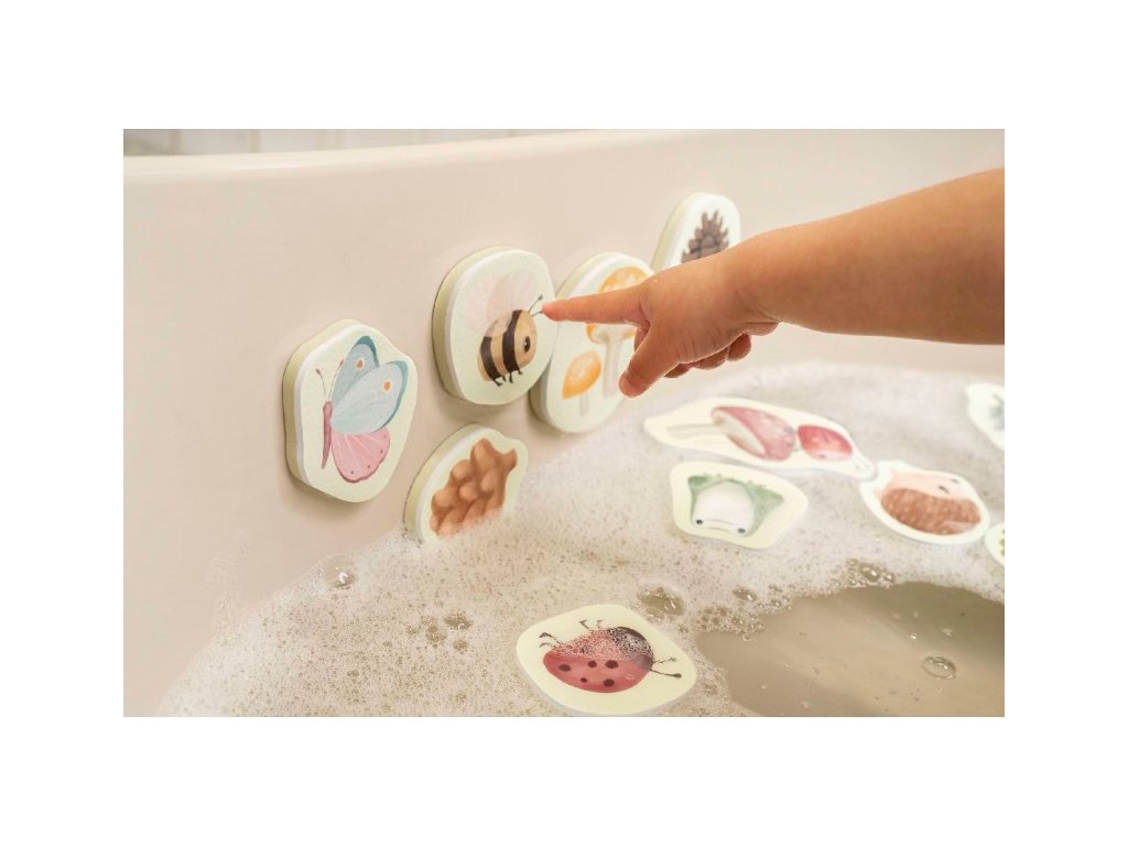 Pěnové samolepky do vany s natištěnými motivy ze života v lese zabaví vaše děti při koupání ve vaně. Samolepky stačí namočit a přitisknout je na vanu. Po koupeli je snadno uložíte do síťovinového sáčku s přísavkami, který je součástí výrobku.