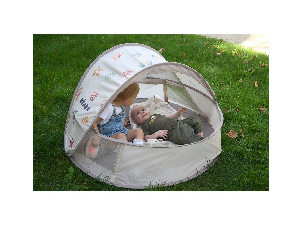 Přenosný univerzální stan s UV faktorem 50+ pro ochranu dítěte před sluncem na zahradě, na pláži či na výletech do přírody. Stan umožňuje snadnou ventilaci díky bočním otvorům se síťovinou a textilními chlopněmi, které je možné srolovat. Síťovina chrání dítě ve stanu před obtížným hmyzem. Tkanina s chladivým efektem pomáhá snižovat teplotu uvnitř stanu.