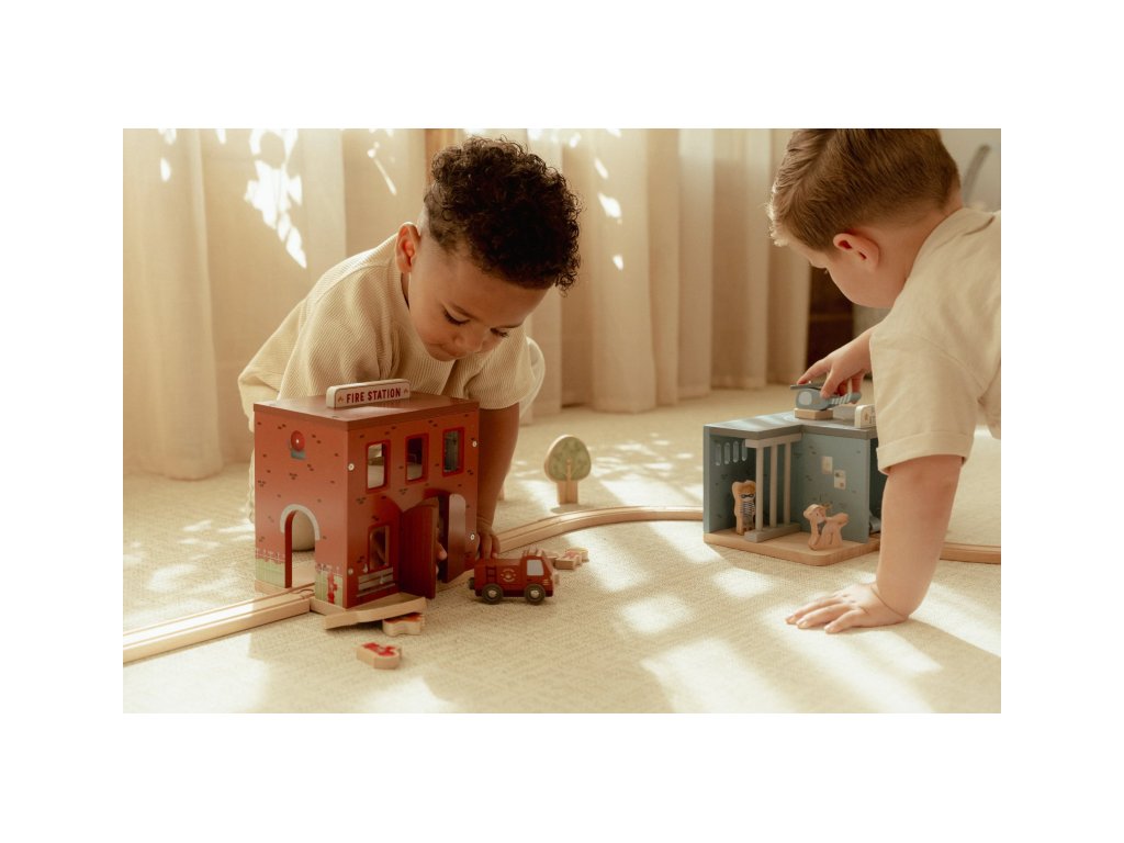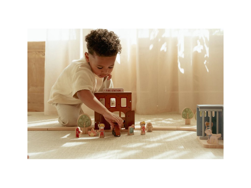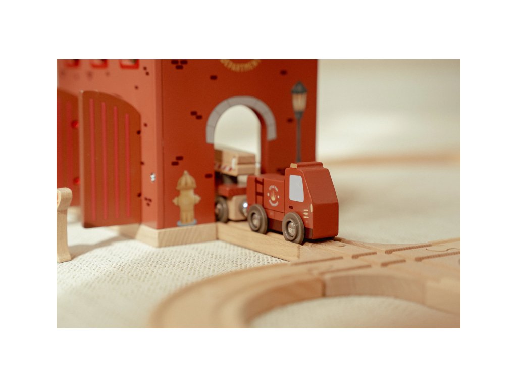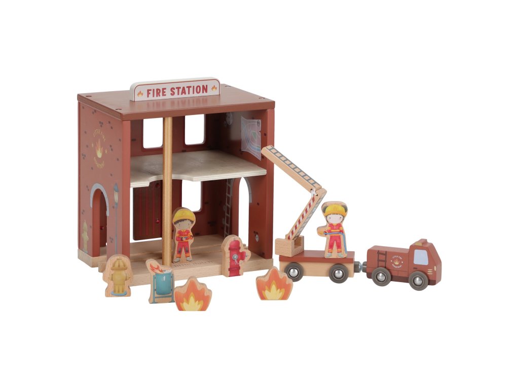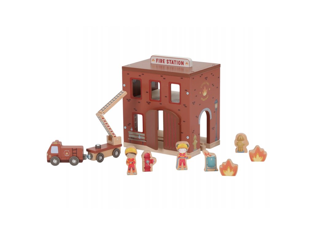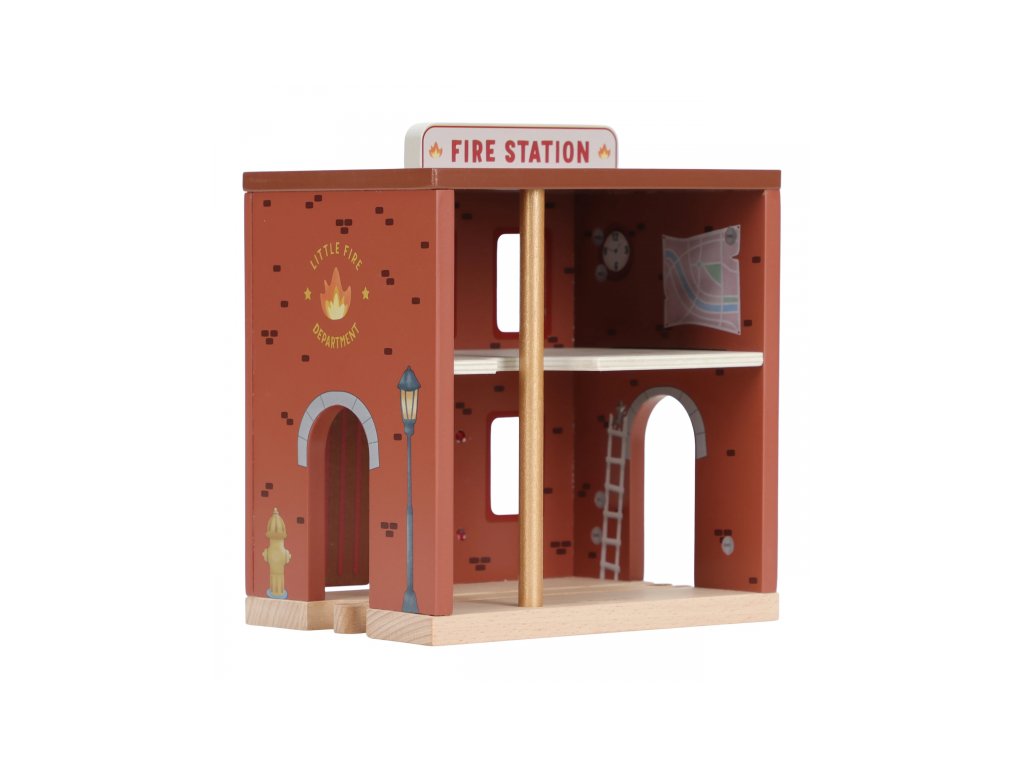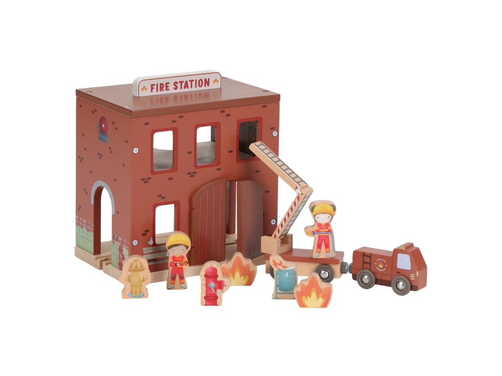 Součástí sady jsou figurky hasičů, oheň a hořící popelnice pro realistické hraní. Dveře stanice lze otevřít, aby mohl zásah začít co nejrychleji. Hasičská stanice je kompatibilní s dřevěnou vláčkodráhou Little Dutch, což umožňuje ještě více zábavy a kombinací.