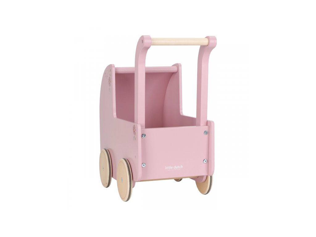 Kočárek je díky kvalitní dřevěné konstrukci velmi stabilní. Kolečka mají po obvodu gumové kroužky, které zabrání poškrábání podlahy a umožňují nehlučnou jízdu.
