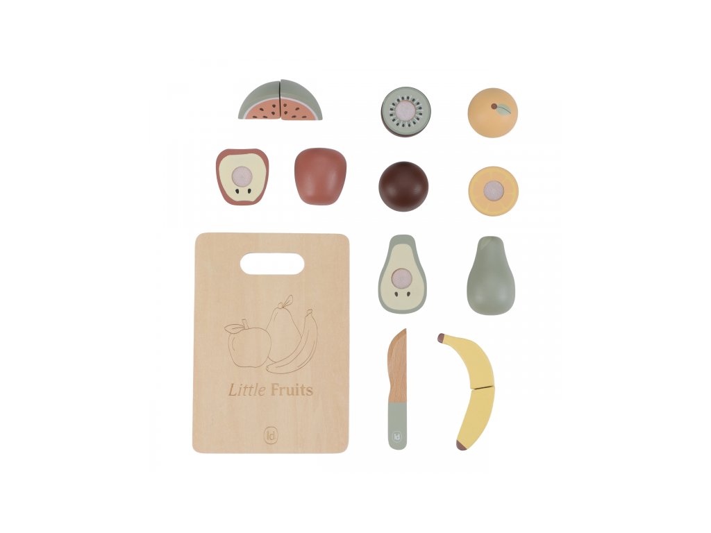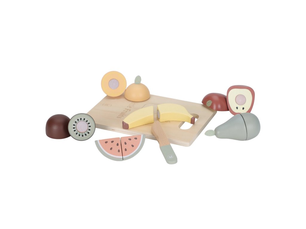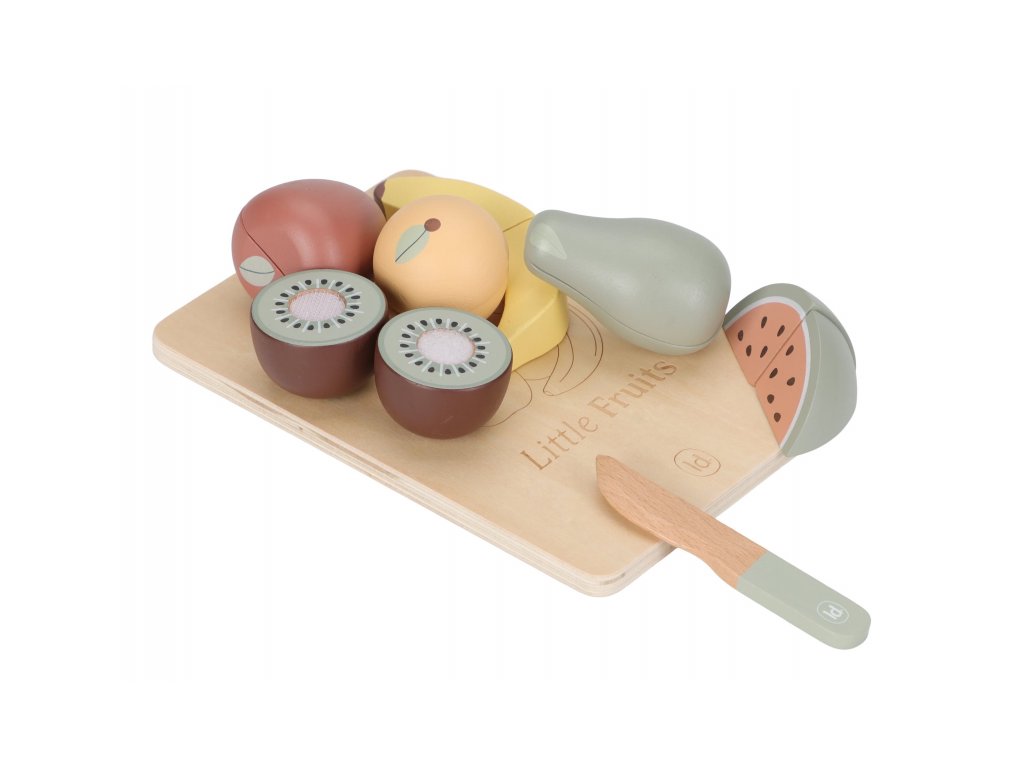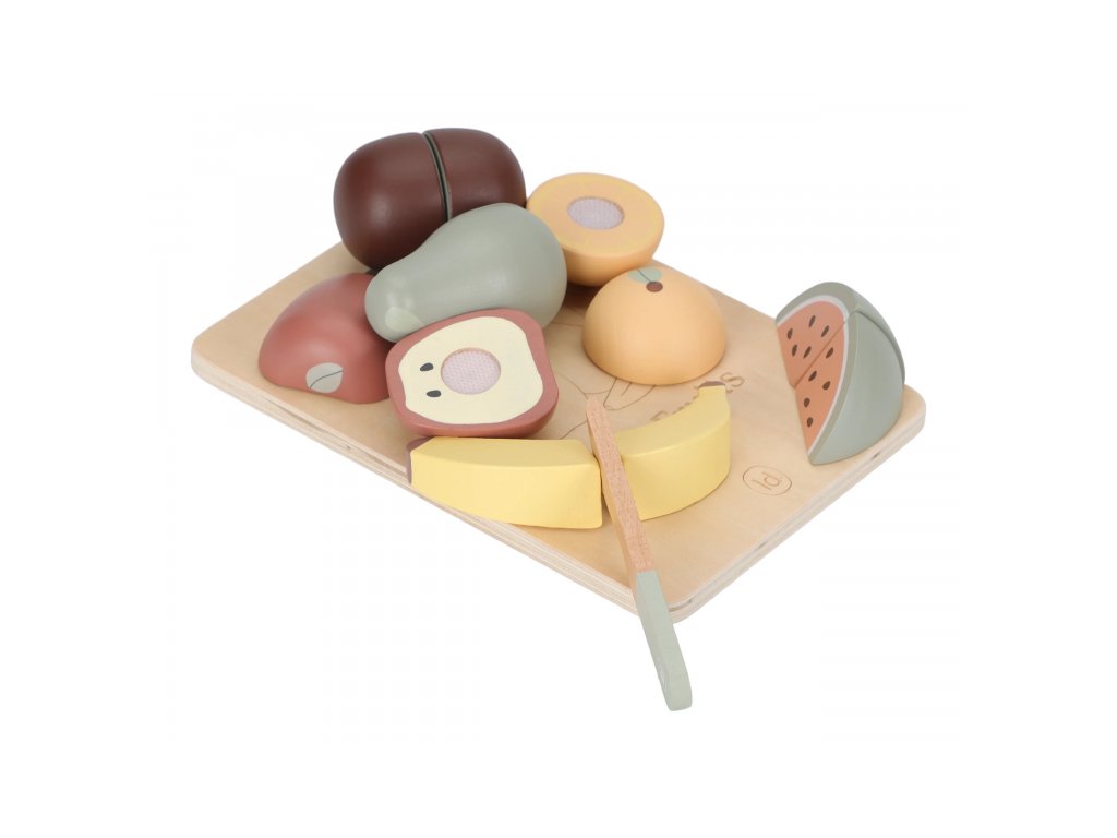 Připravte ovocnou svačinku s touto veselou sadou dřevěného krájecího ovoce! V sadě najdete šest druhů ovoce: jablko, hrušku, banán, kiwi, pomeranč a kousek melounu – každý z nich lze rozkrojit dřevěným nožíkem na dvě poloviny a díky suchému zipu je opět snadno spojíte zpět.