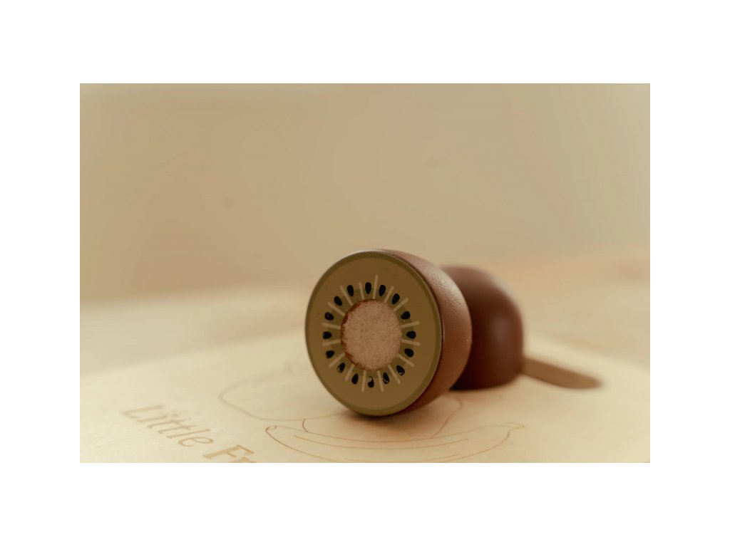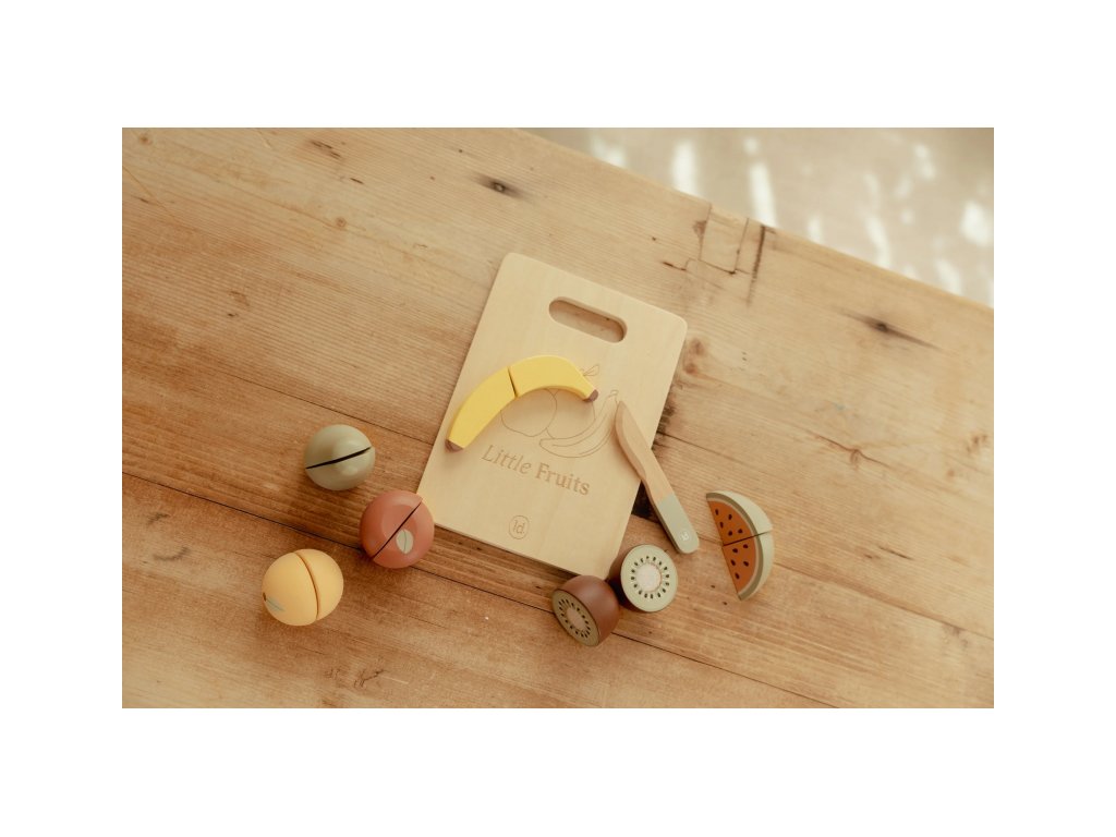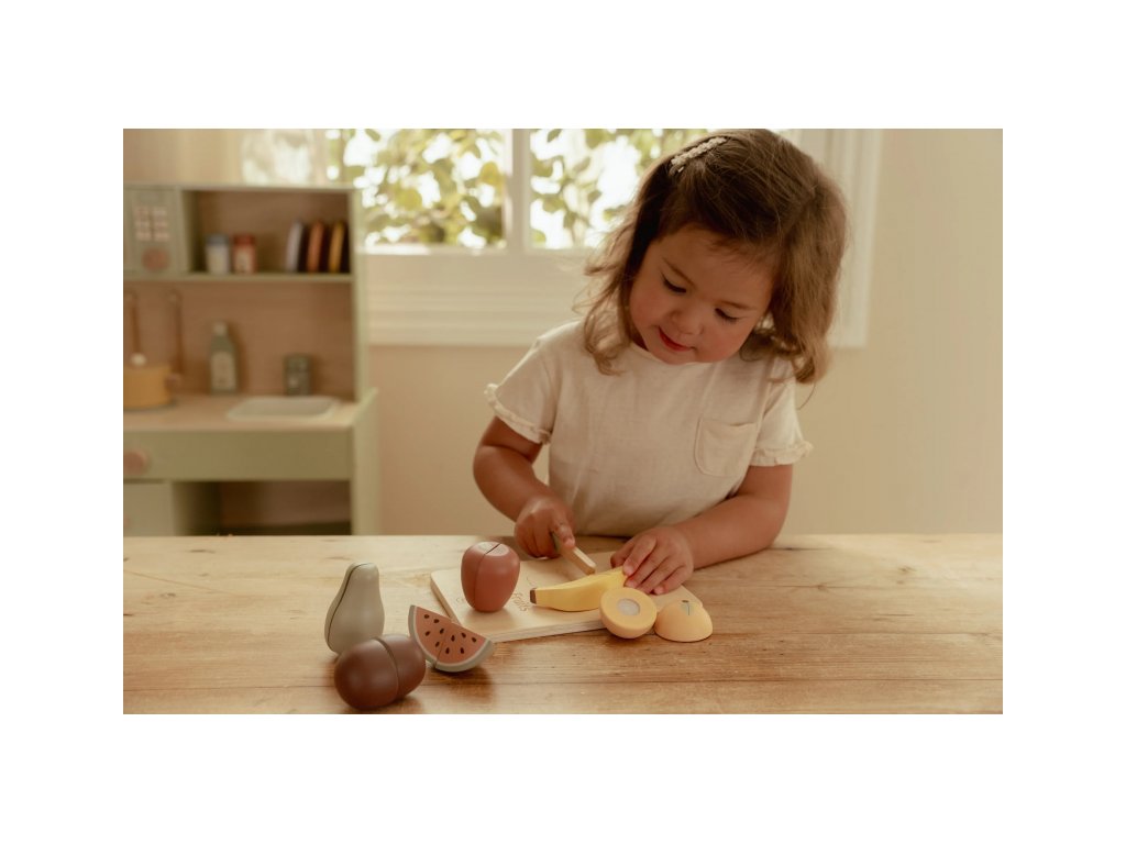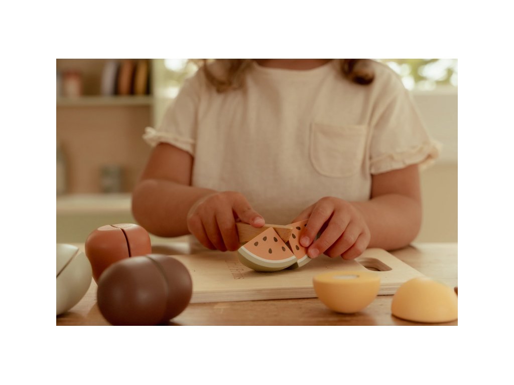 Součástí sady je i krájecí prkénko a dřevěný nůž, takže si malí kuchaři mohou vyzkoušet přípravu zdravé svačiny přesně jako dospělí. Skvělý způsob, jak rozvíjet jemnou motoriku, koordinaci ruky a oka i hru na role.