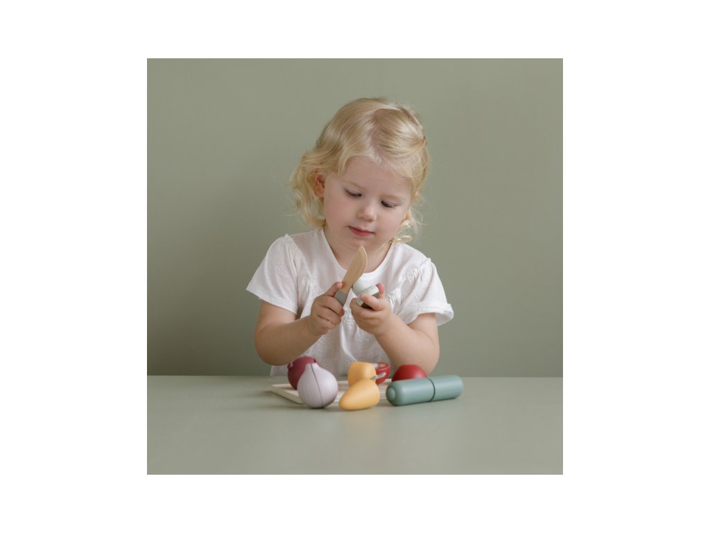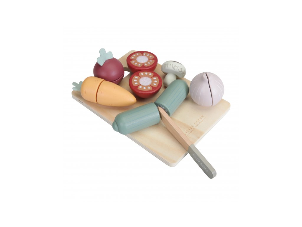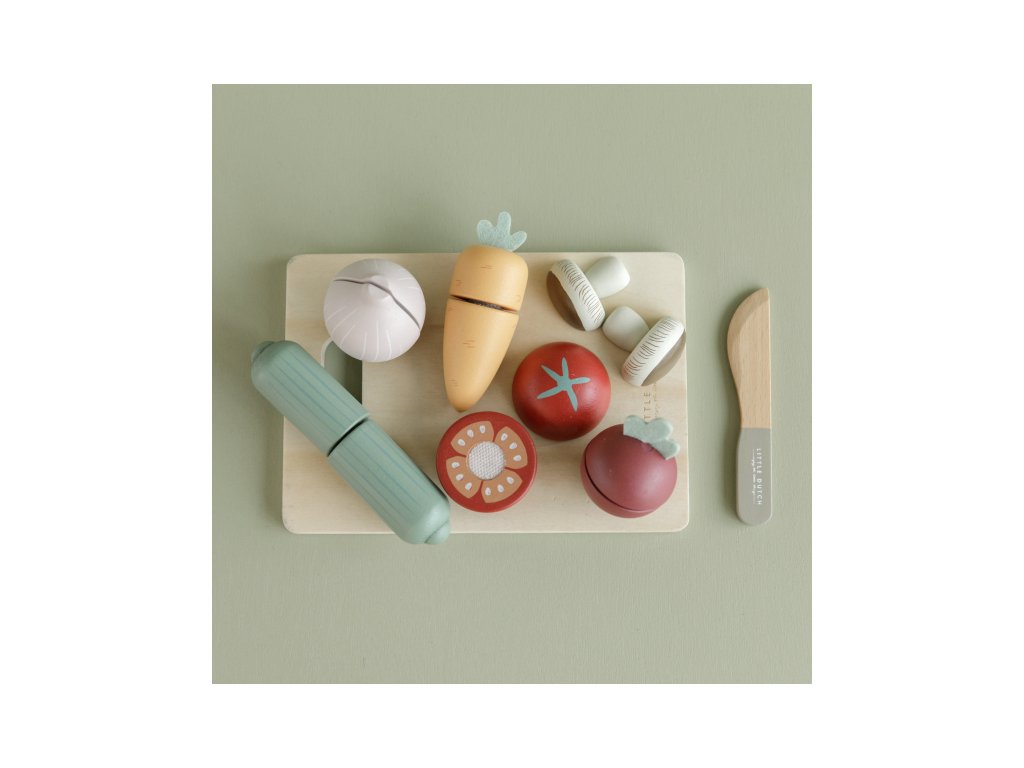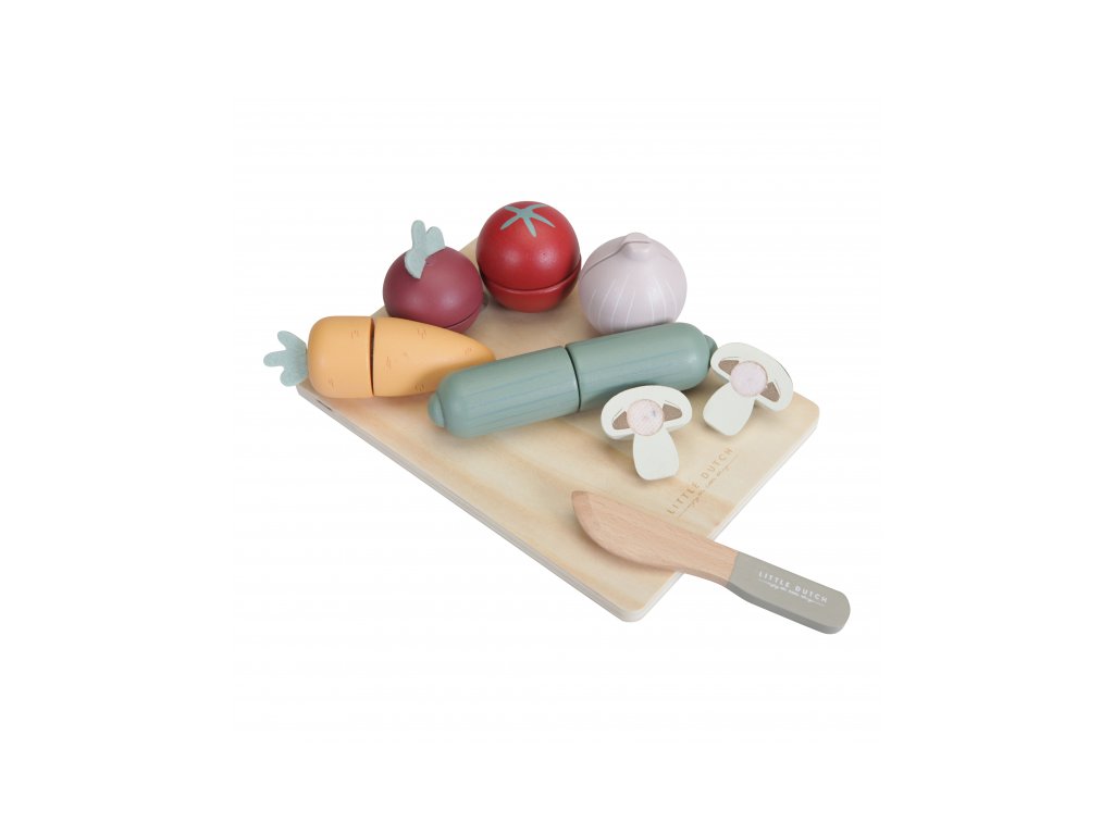 Zeleninu je potřeba před vařením nakrájet, to ví každý malý kuchař i kuchařka. Tato dřevěná sada obsahuje 6 druhů zeleniny (mrkev, okurku, hříbek, rajče, cibuli a červenou řepu), dřevěný nožík a krájecí prkénko. Každý kousek zeleniny je možné rozdělit na dva kusy a opět spojit pomocí suchého zipu.