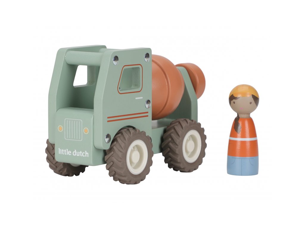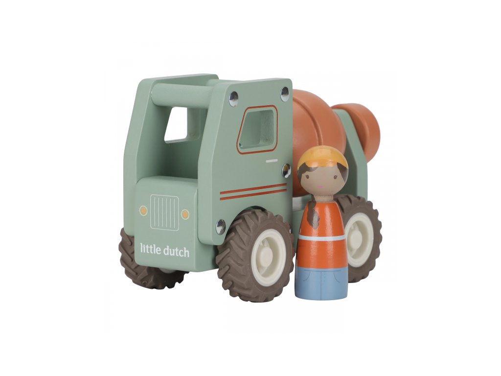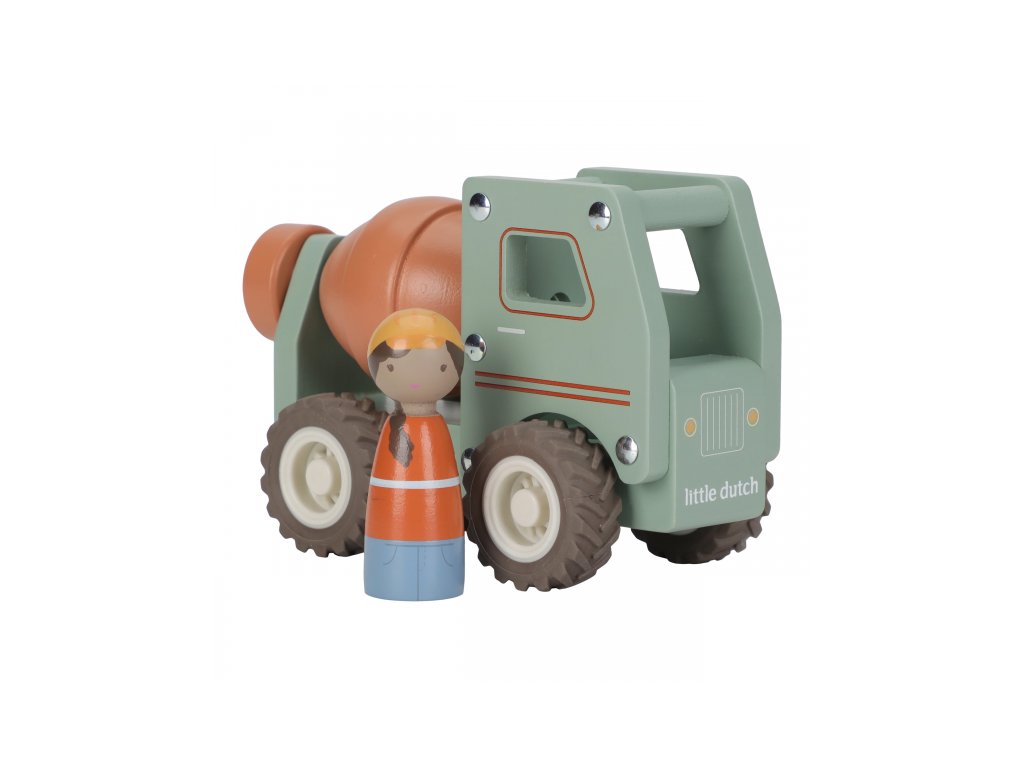 Součástí hračky je dřevěná figurka stavbyvedoucího, která dodá hře ještě více zábavy a realismu. Míchačku můžete kombinovat s dalšími stavebními vozidly – například s nakladačem, autojeřábem nebo sklápěčkou – pro kompletní stavební dobrodružství.