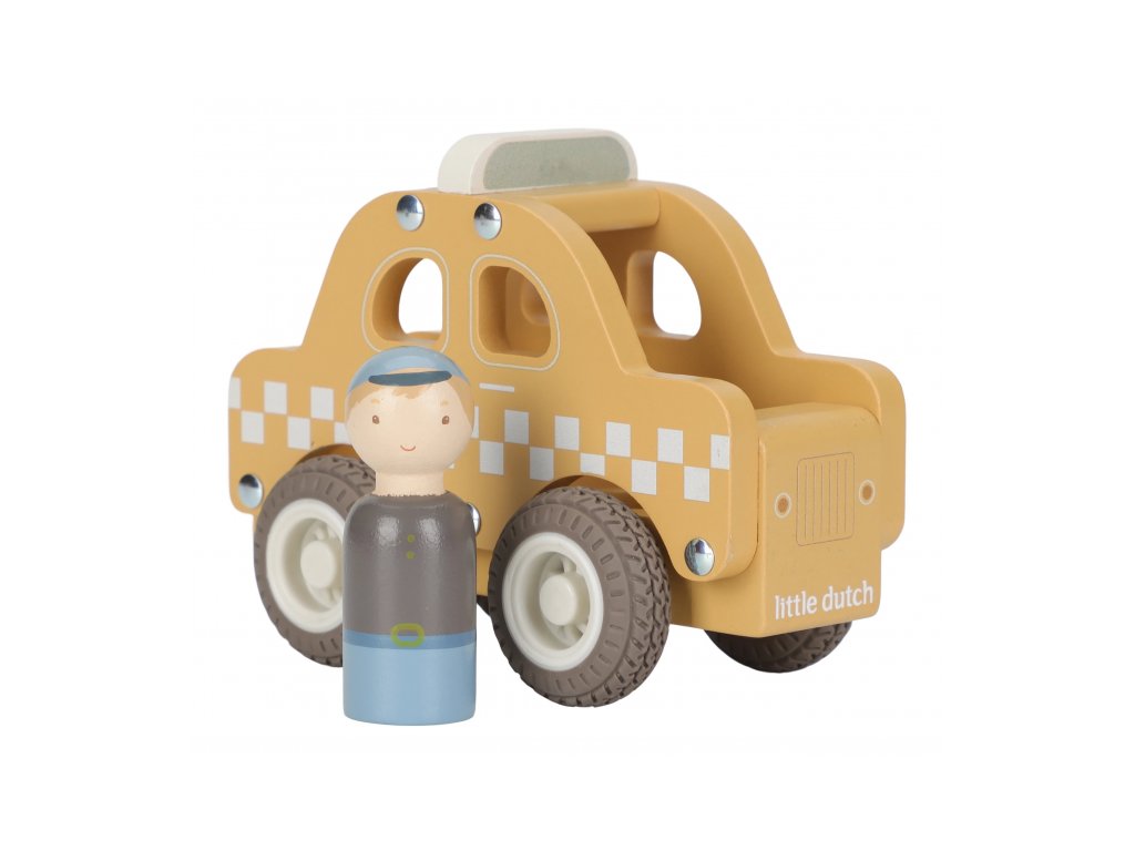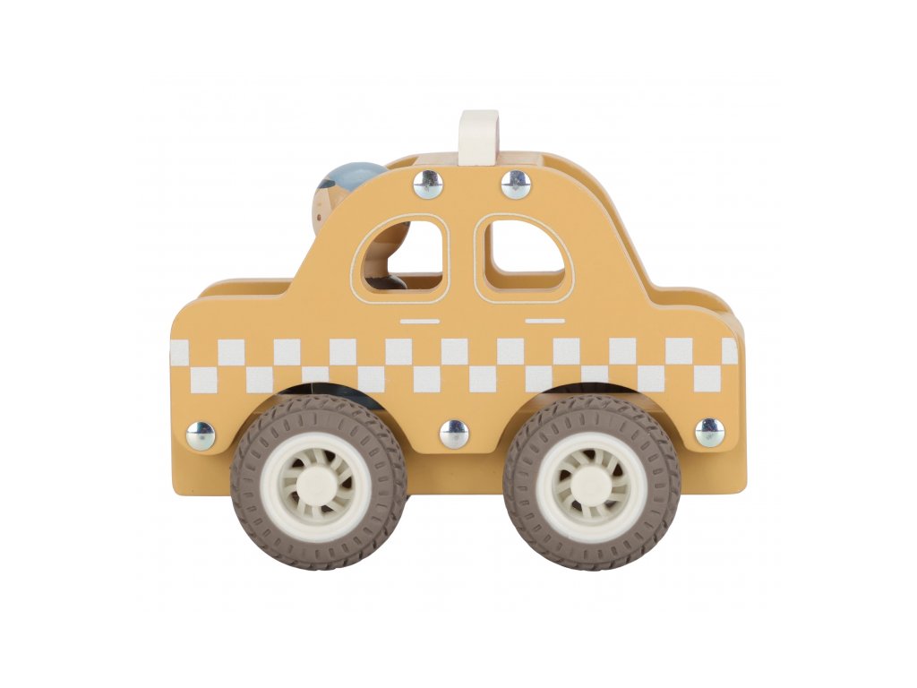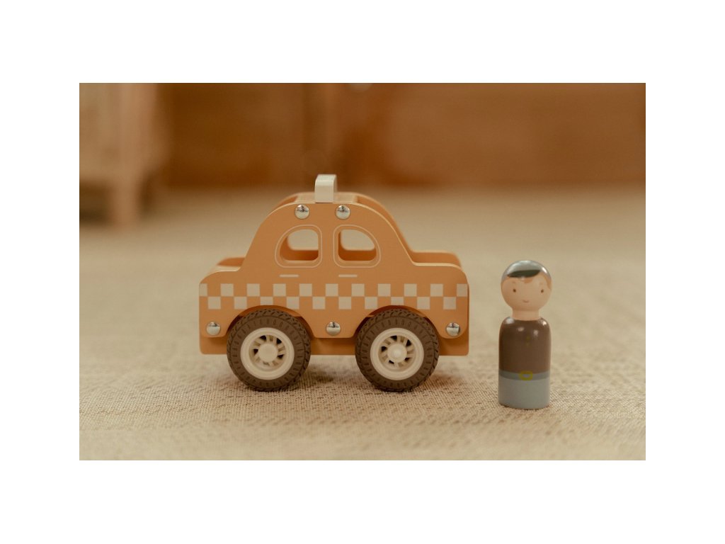 Naskočte a nechte se odvézt! Toto dřevěné taxi je připraveno bezpečně dopravit každého cestujícího do cíle. Díky gumovým pneumatikám se hladce pohybuje po podlaze, a sympatický řidič už čeká, až vyrazíte na cestu.